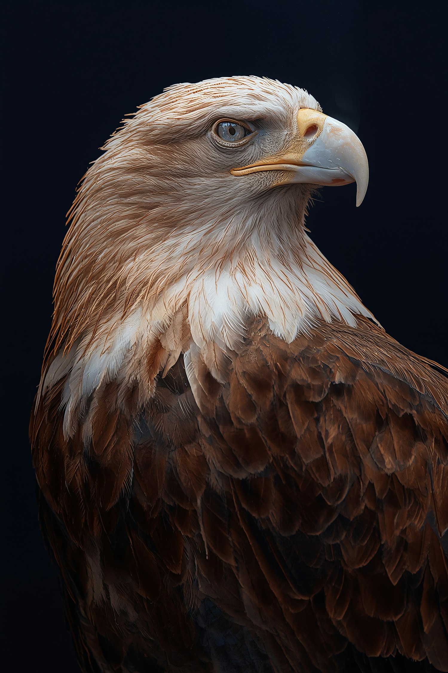 A stunning close-up of a bald eagle with detailed feathers and a sharp gaze, set against a dark background for dramatic effect.