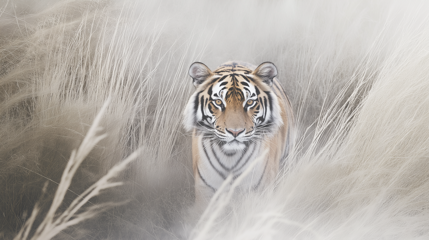 A Bengal tiger prowls through pale, feathery grass, its amber eyes and striped coat creating a striking contrast in a serene, dreamlike setting.