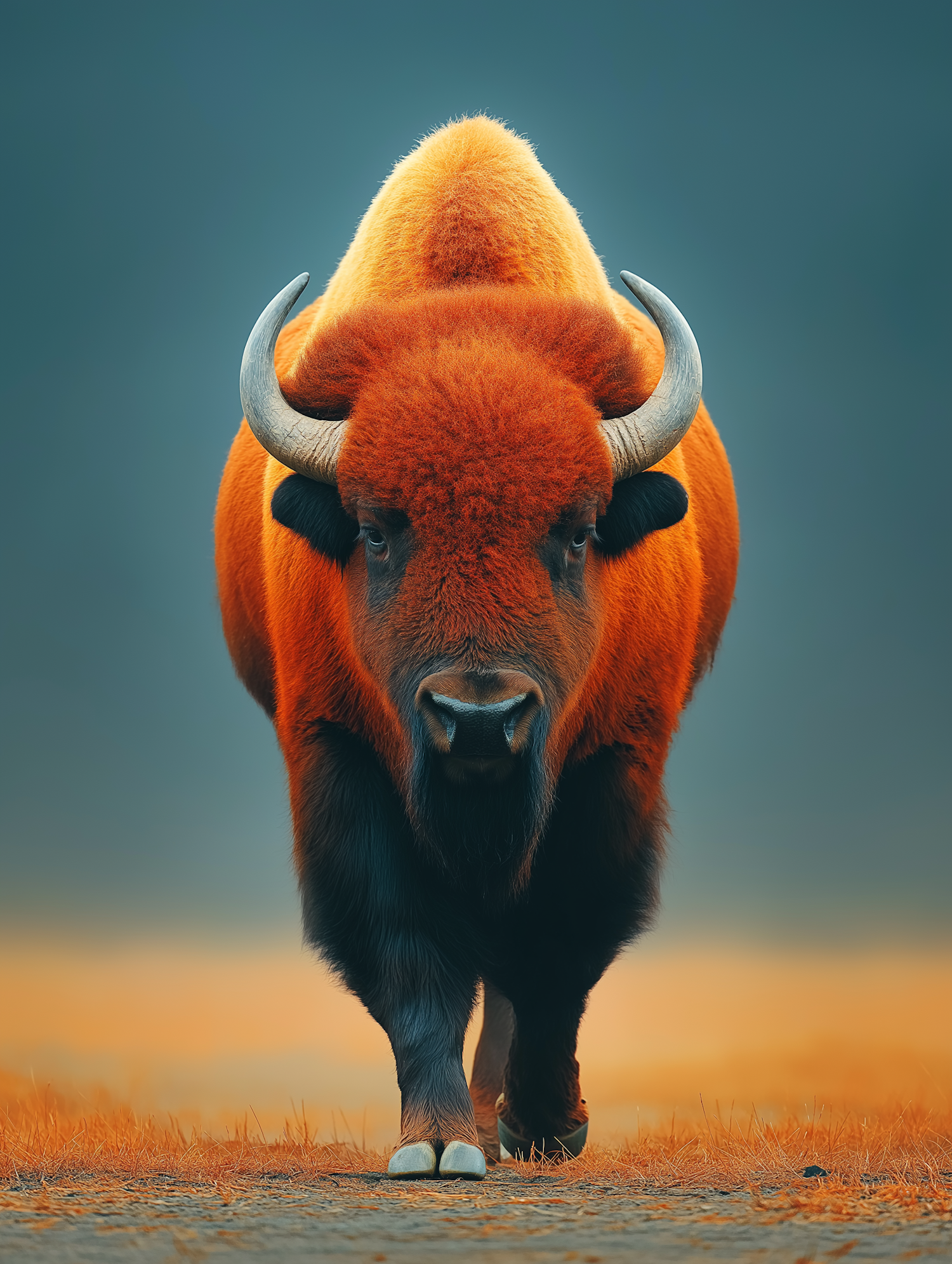 A powerful bison with reddish-brown fur and curved horns stands on golden grass, set against a muted blue-green background.