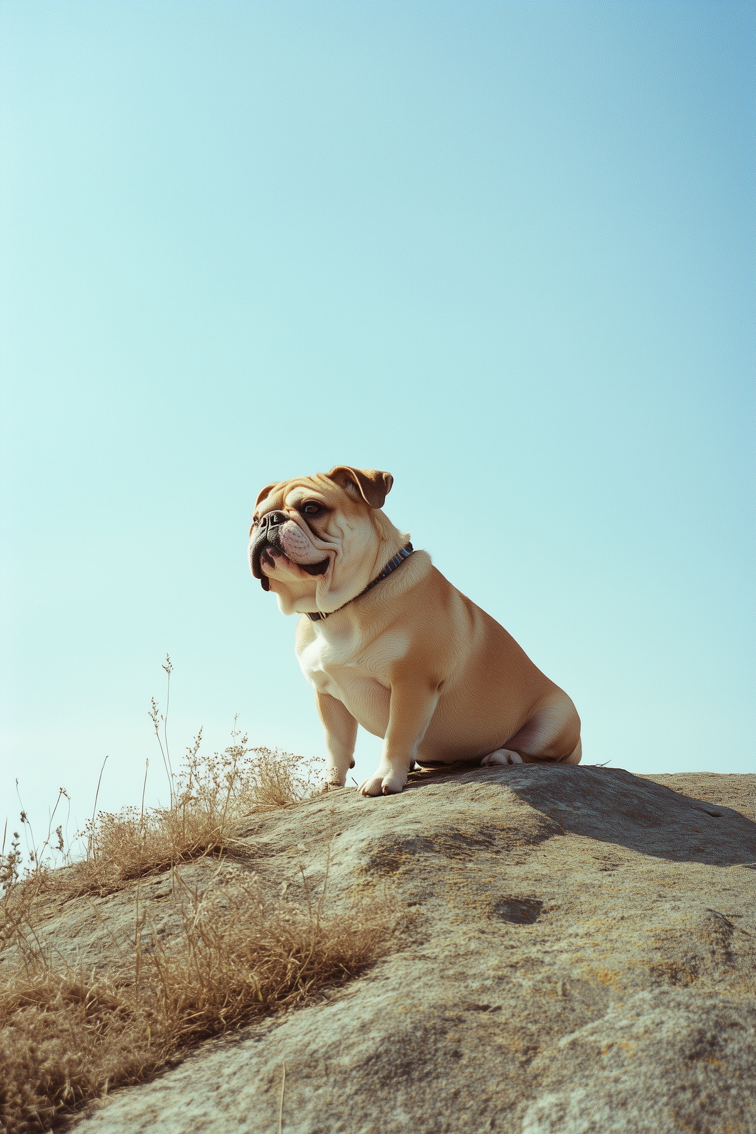 Majestic bulldog sitting on a rock under a clear blue sky, exuding calm and confidence in a serene natural setting.
