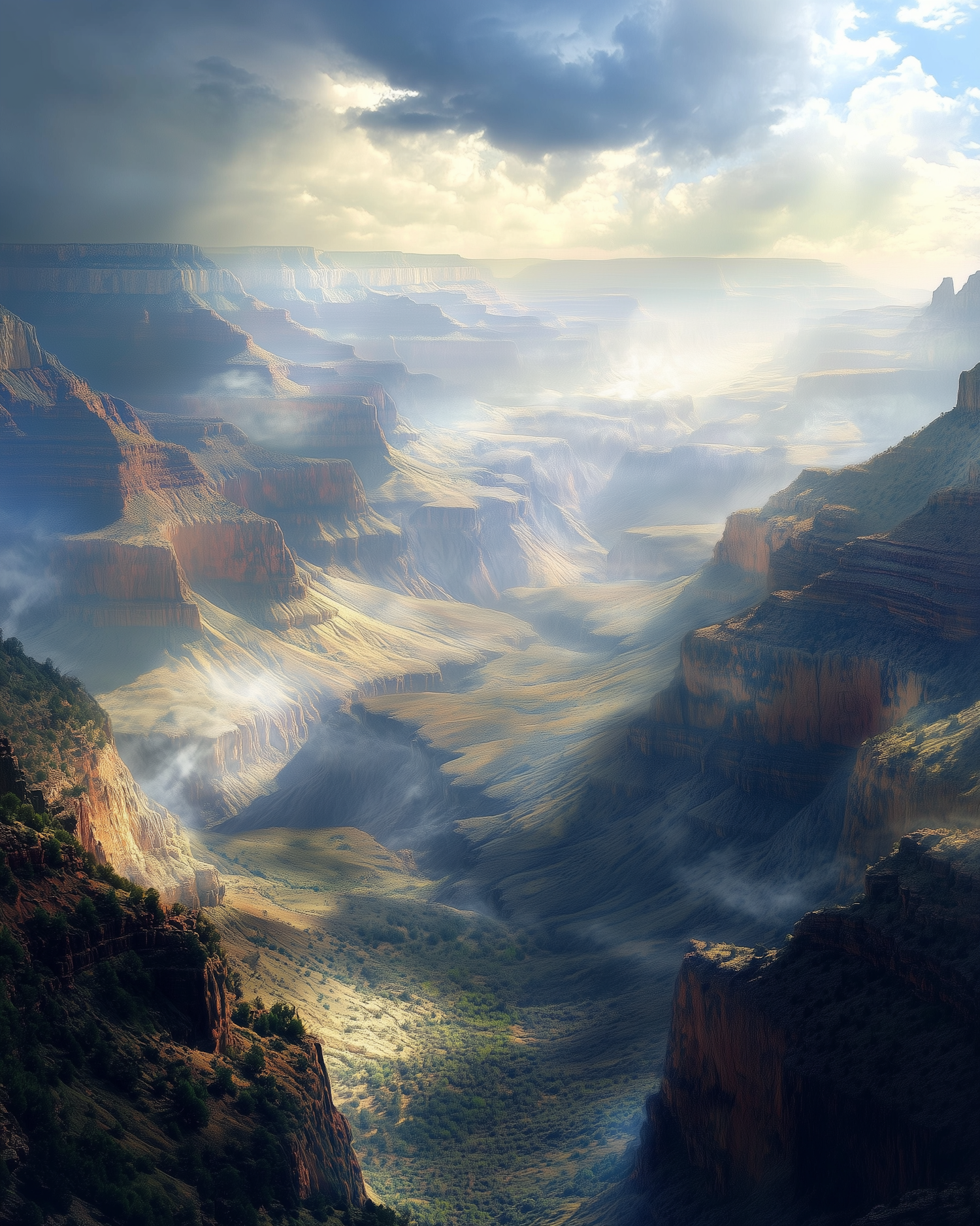 Majestic canyon landscape with dramatic lighting, mist, and vibrant rock formations. A stunning blend of nature's beauty and mystery.