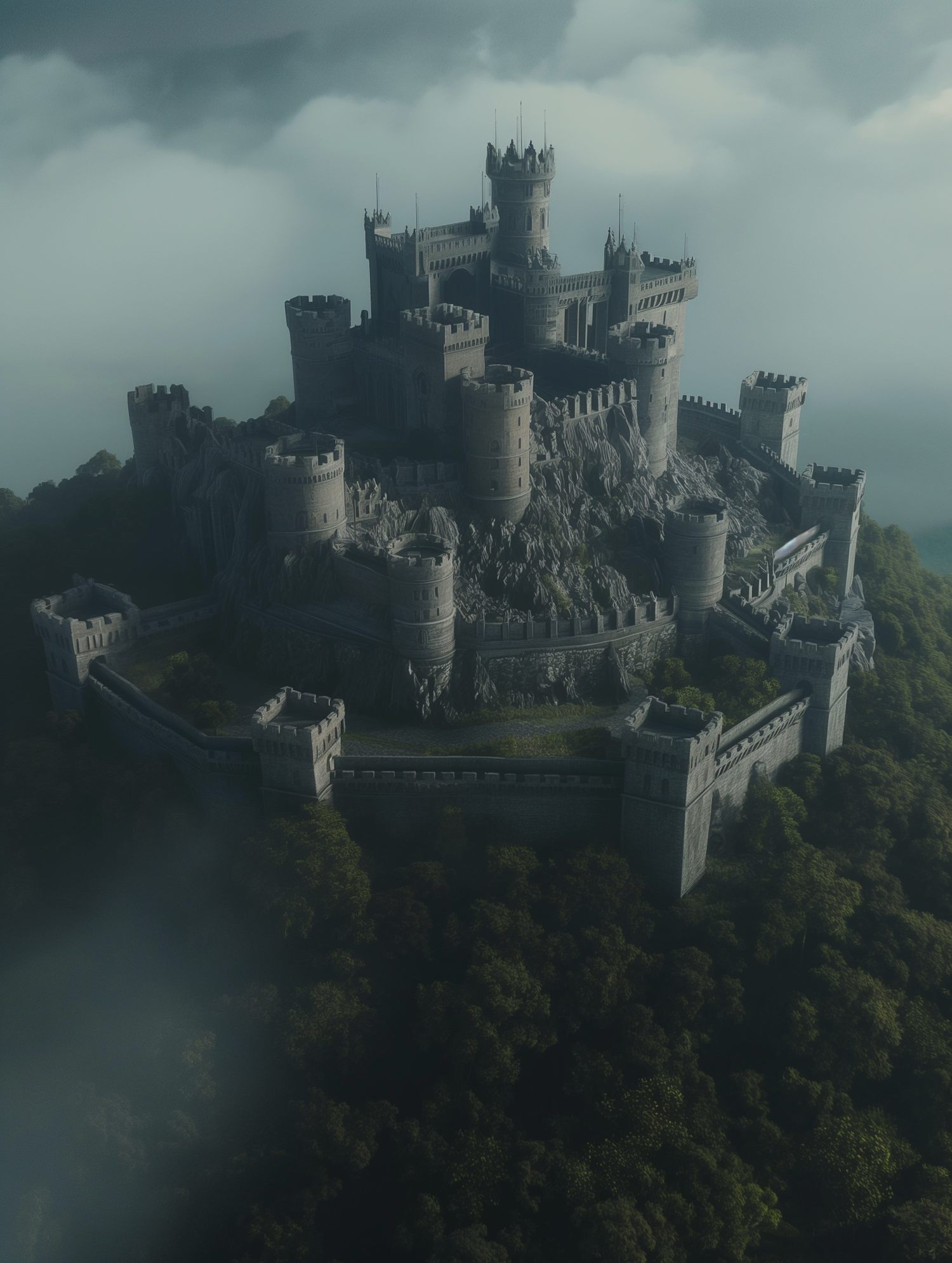 Majestic medieval castle on a rocky hill, surrounded by lush forests and mist, with towering stone walls and turrets under an overcast sky.