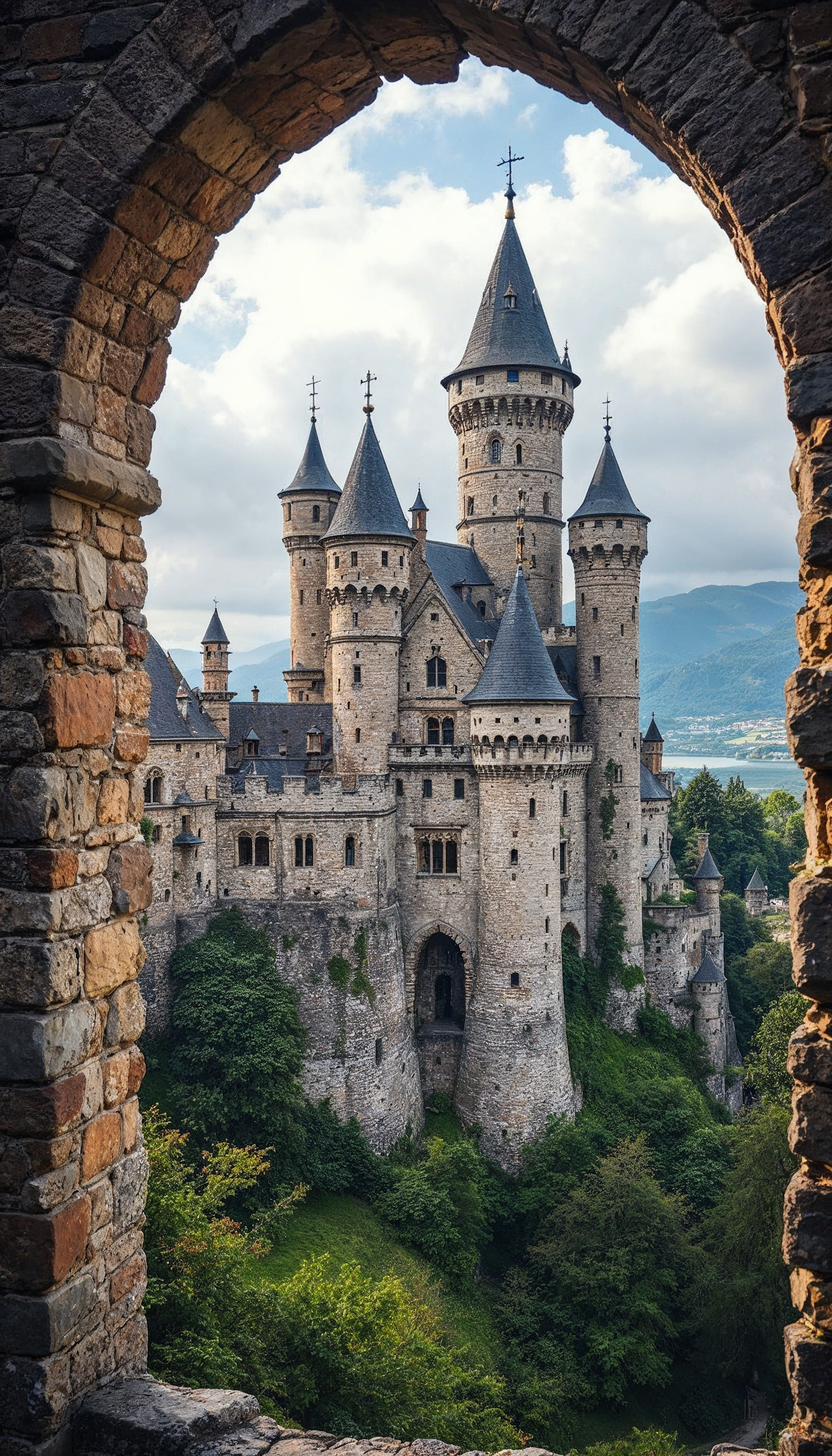 Majestic medieval castle with pointed towers framed by a stone archway, set against lush greenery and distant mountains.