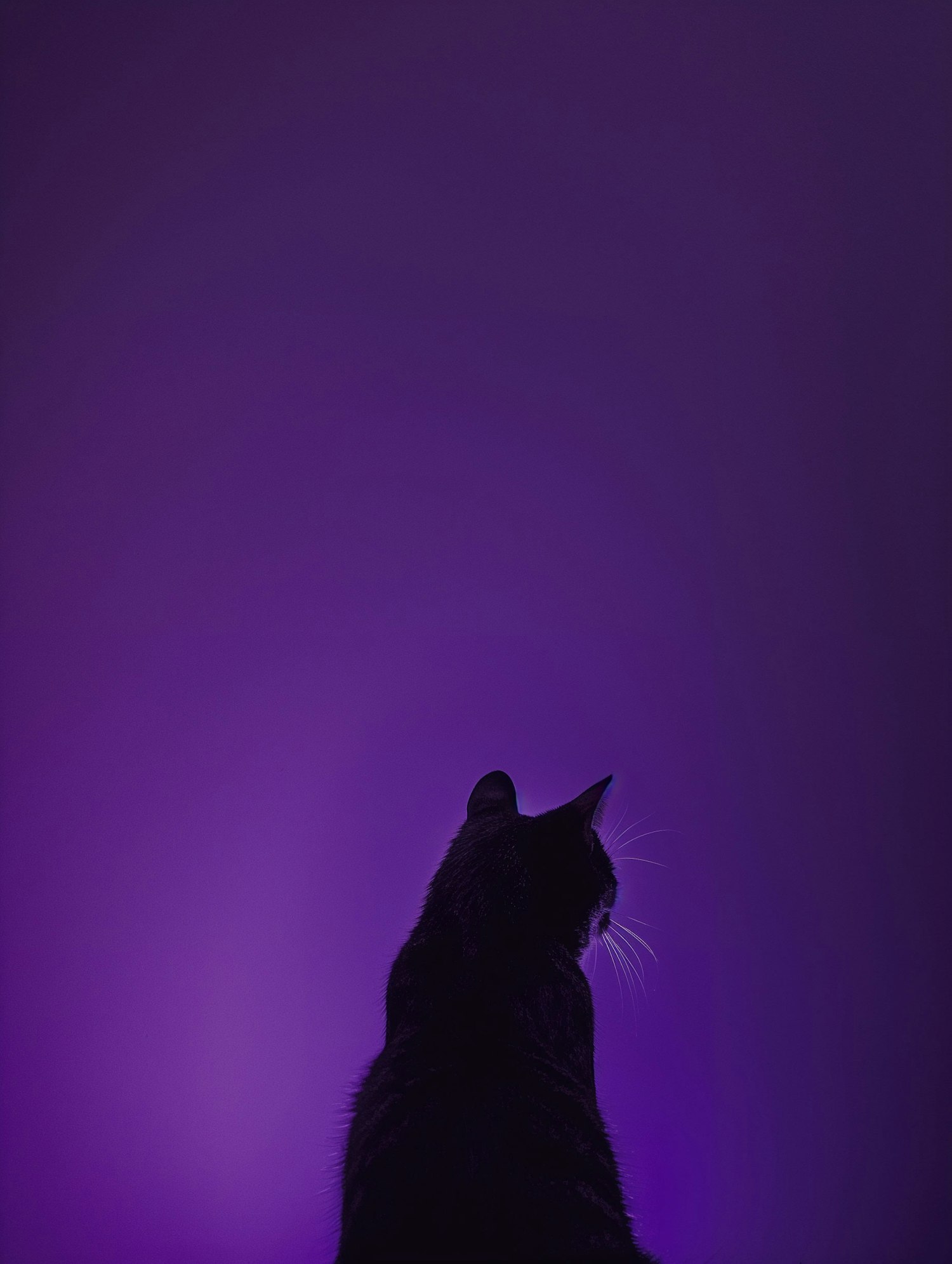 A black cat silhouetted against a vibrant purple background, creating a mysterious and serene atmosphere.