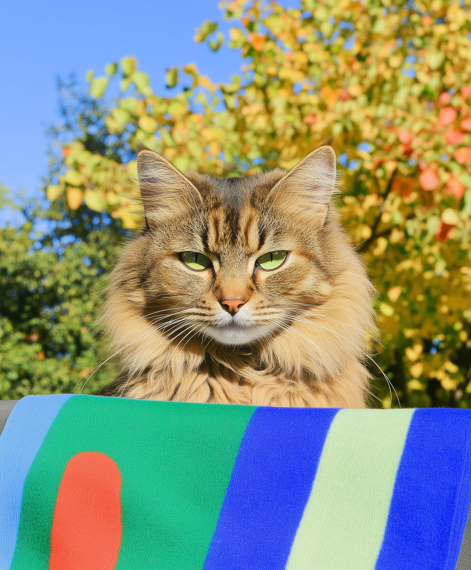 Fluffy tabby cat with green eyes sits by a colorful blanket outdoors, framed by autumn foliage and a clear blue sky.