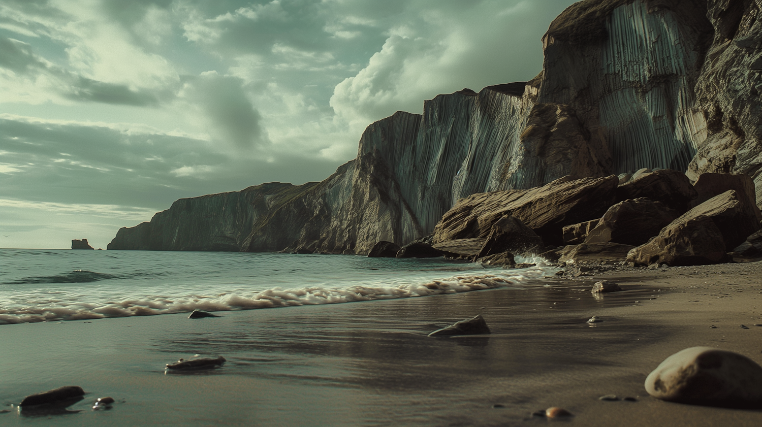 Dramatic coastal cliffs with textured striations, a calm ocean, and an overcast sky create a tranquil yet mysterious atmosphere.