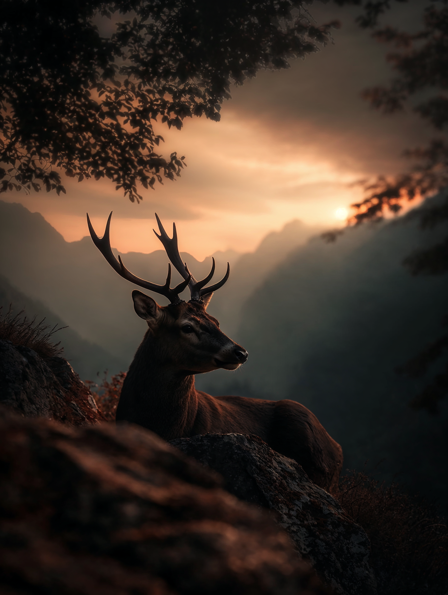 A majestic deer with antlers stands in golden sunset light, surrounded by rocky terrain and misty mountains in the background.