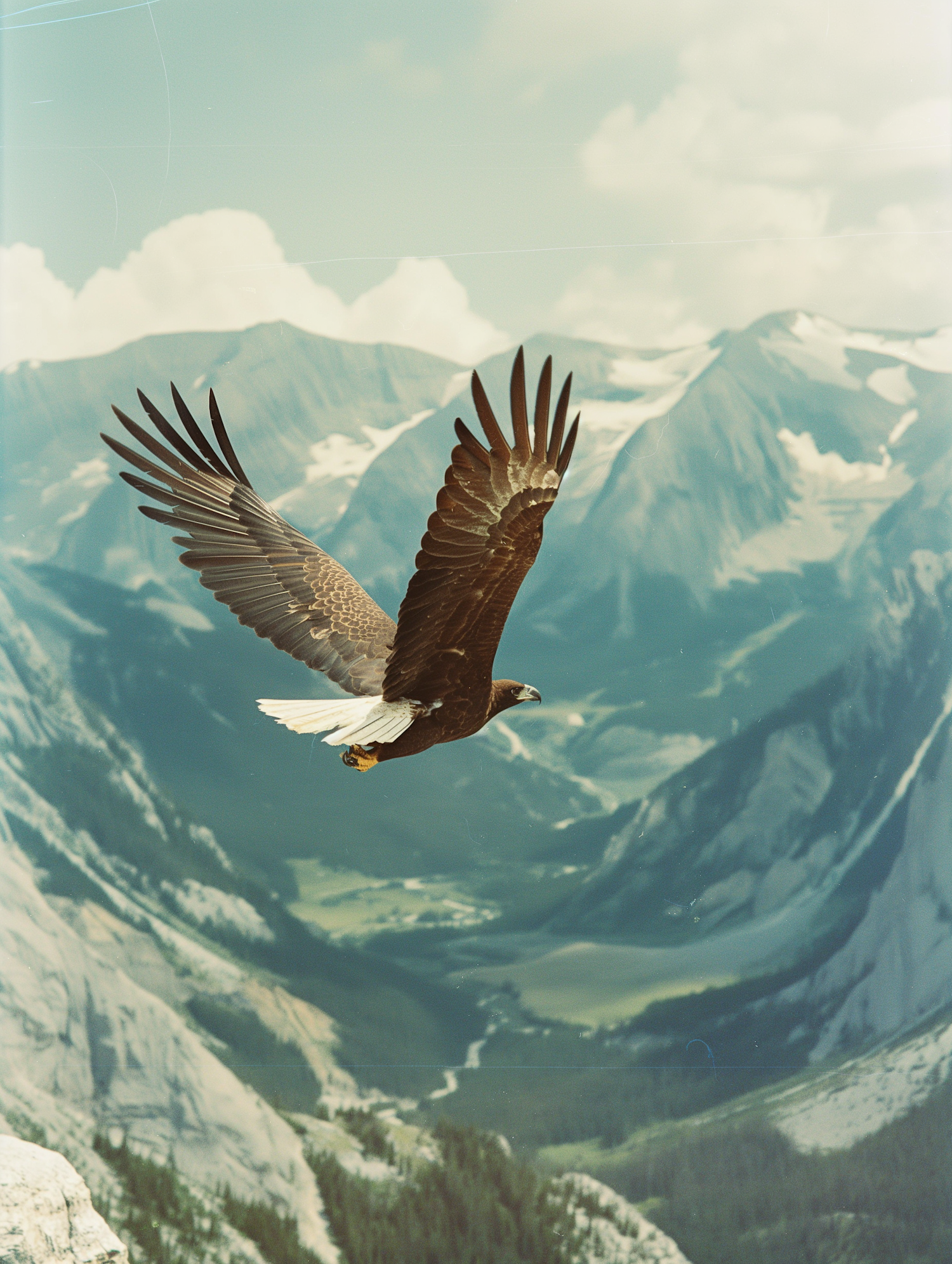 Majestic eagle soaring over snow-capped mountains under a blue sky, capturing the essence of freedom and nature's beauty.