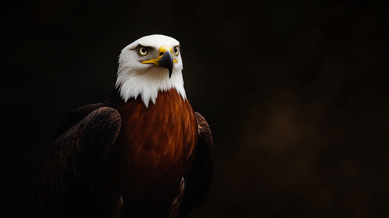Majestic eagle with white head and piercing eyes against a dark background, showcasing its powerful presence and striking features.