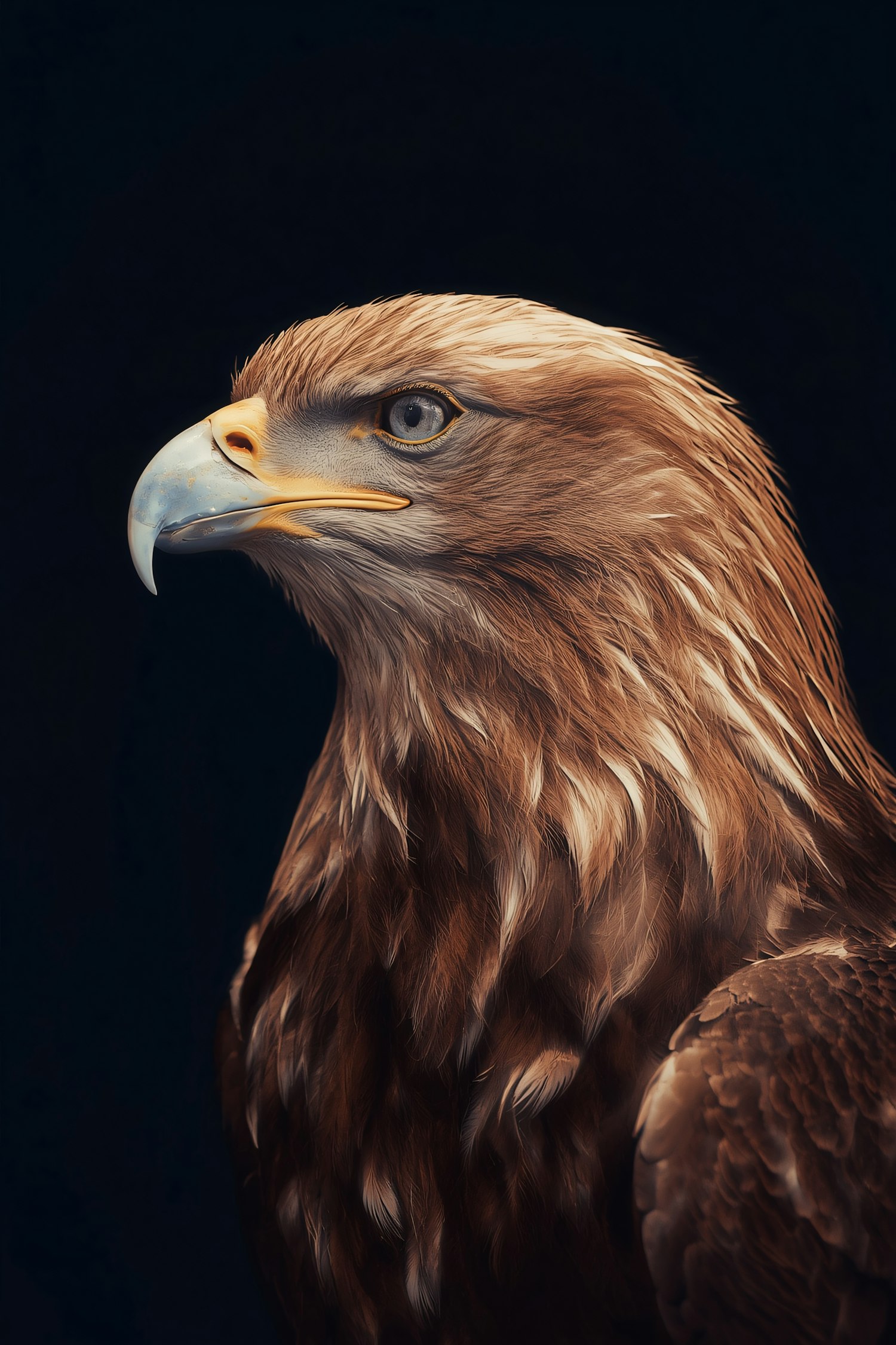 A stunning close-up of an eagle with detailed feathers and a sharp gaze, set against a dramatic black background.