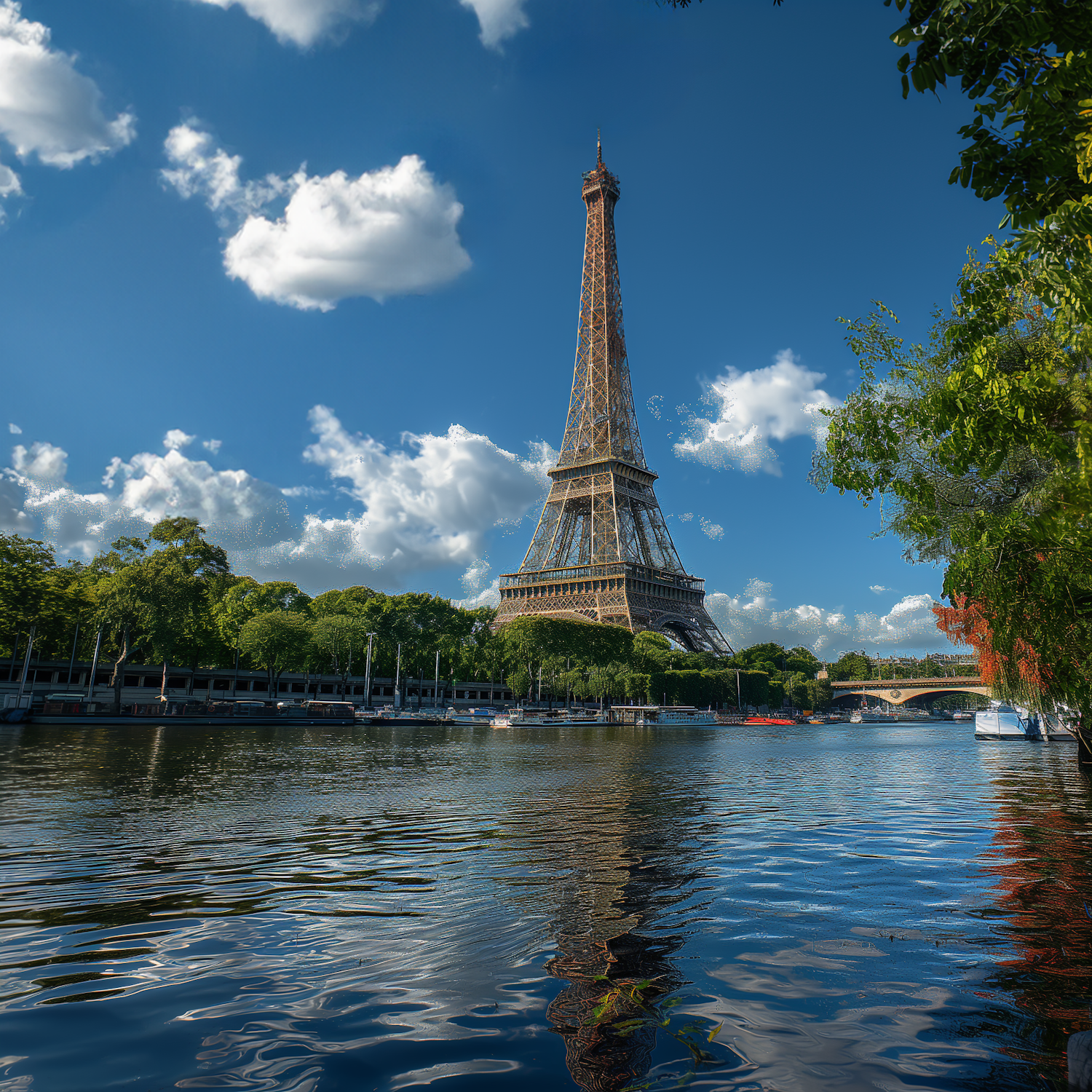 Eiffel Tower with a blue sky and clouds, reflected in the Seine River, surrounded by lush greenery and a picturesque bridge.