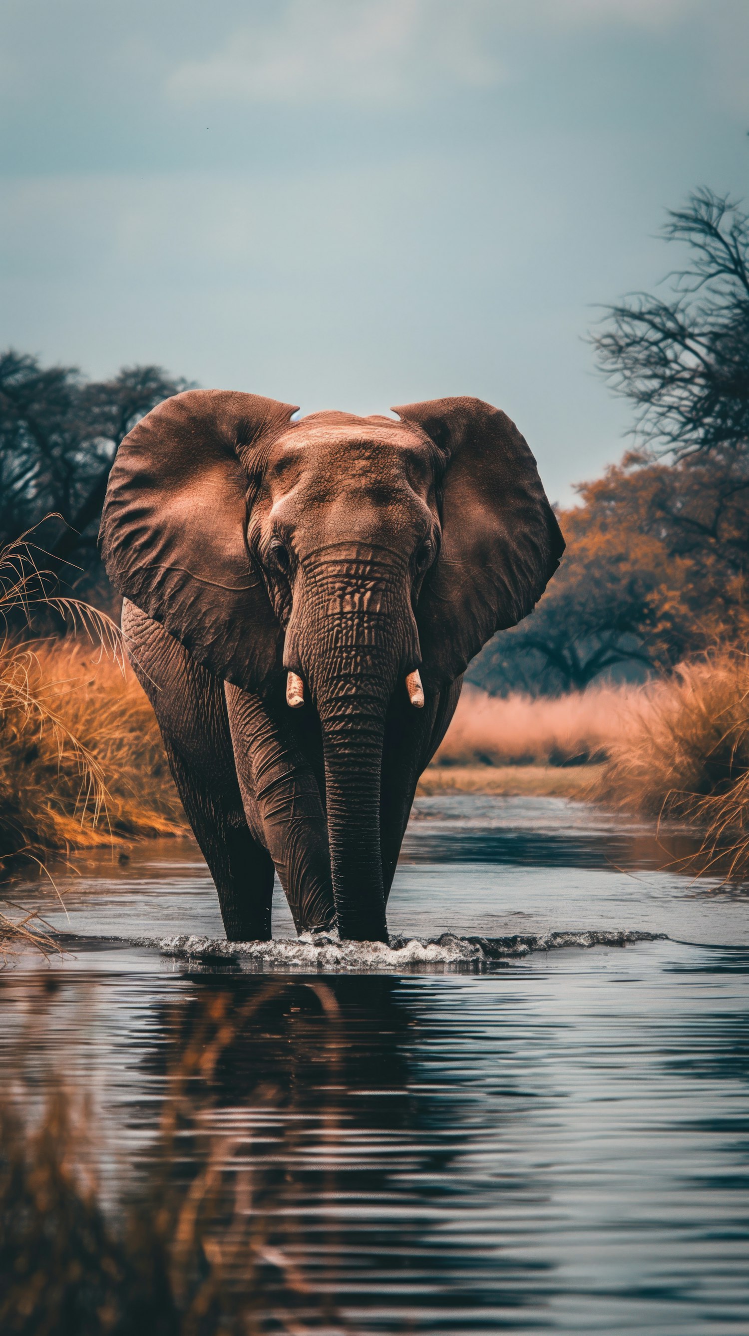 Majestic elephant wading through a serene river, surrounded by tall grasses and trees, reflecting a peaceful wilderness.