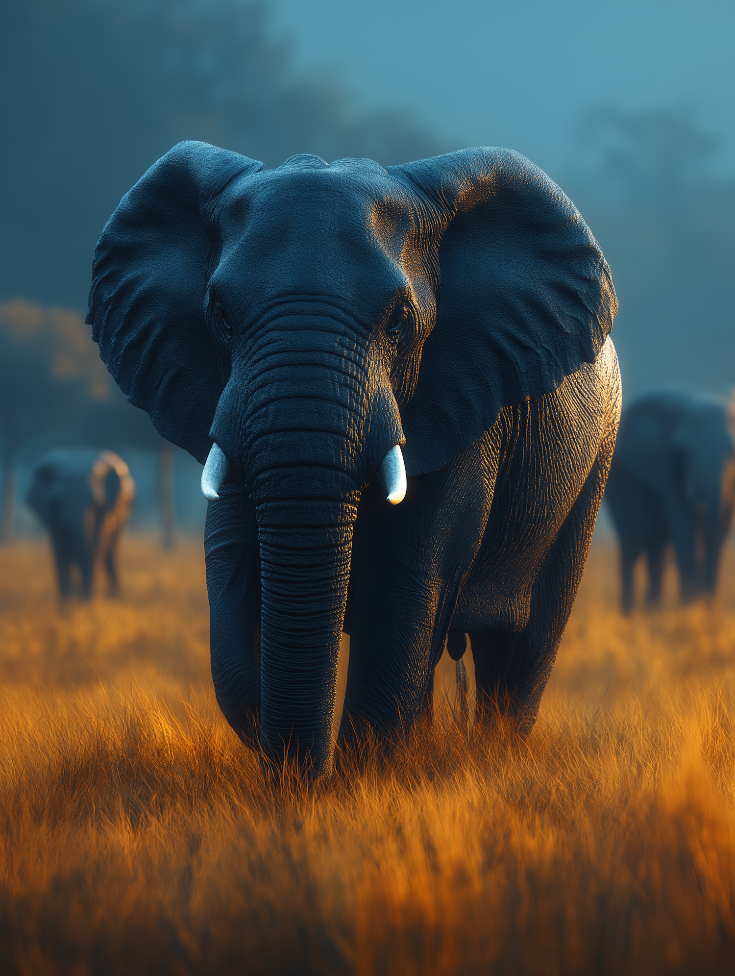 Majestic elephant in golden grass with a serene blue sky, highlighting its textured skin and gleaming tusks.