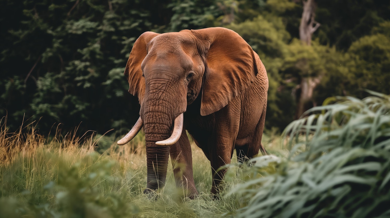 Majestic elephant in lush greenery with prominent tusks and rich brown skin, surrounded by tall grasses and dense foliage.