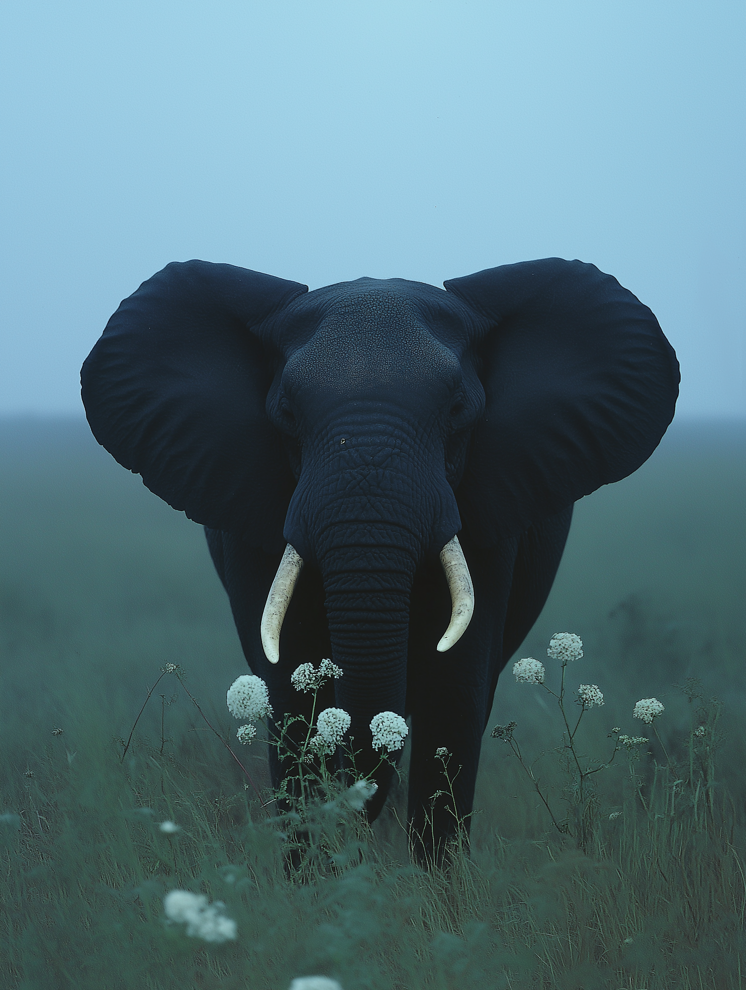 Majestic elephant in a misty field, surrounded by white flowers and tall grasses, creating a serene and mystical atmosphere.