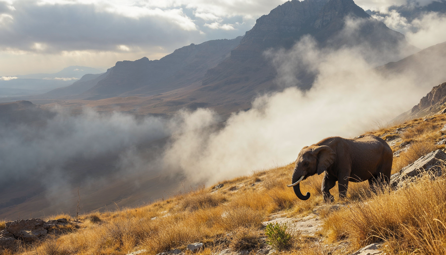 Majestic elephant on a misty hillside with rugged mountains in the background, creating a serene and atmospheric wildlife scene.