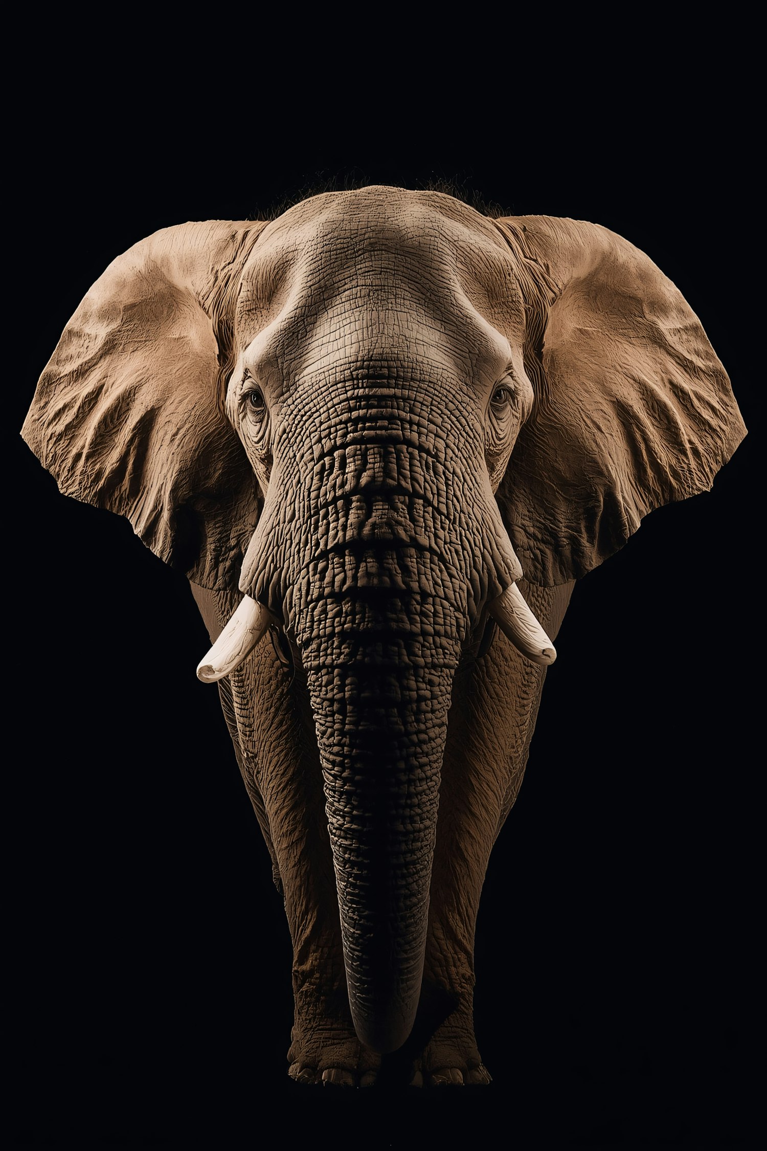 A close-up of an elephant's face with detailed textures and tusks, set against a black background for a dramatic effect.