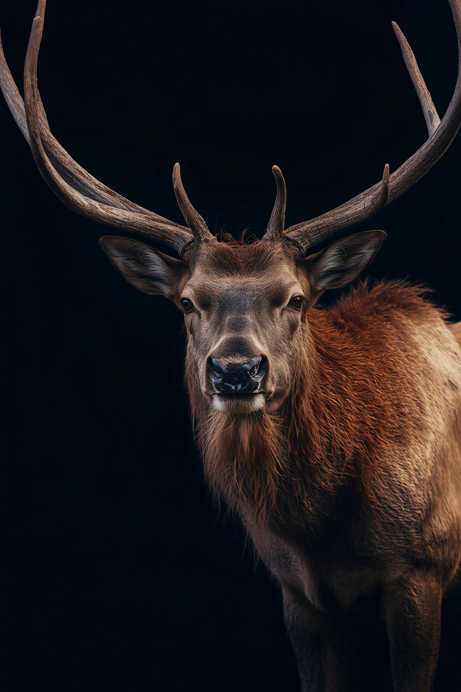 A close-up of a majestic elk with detailed antlers and rich brown fur, set against a dark background for a dramatic effect.