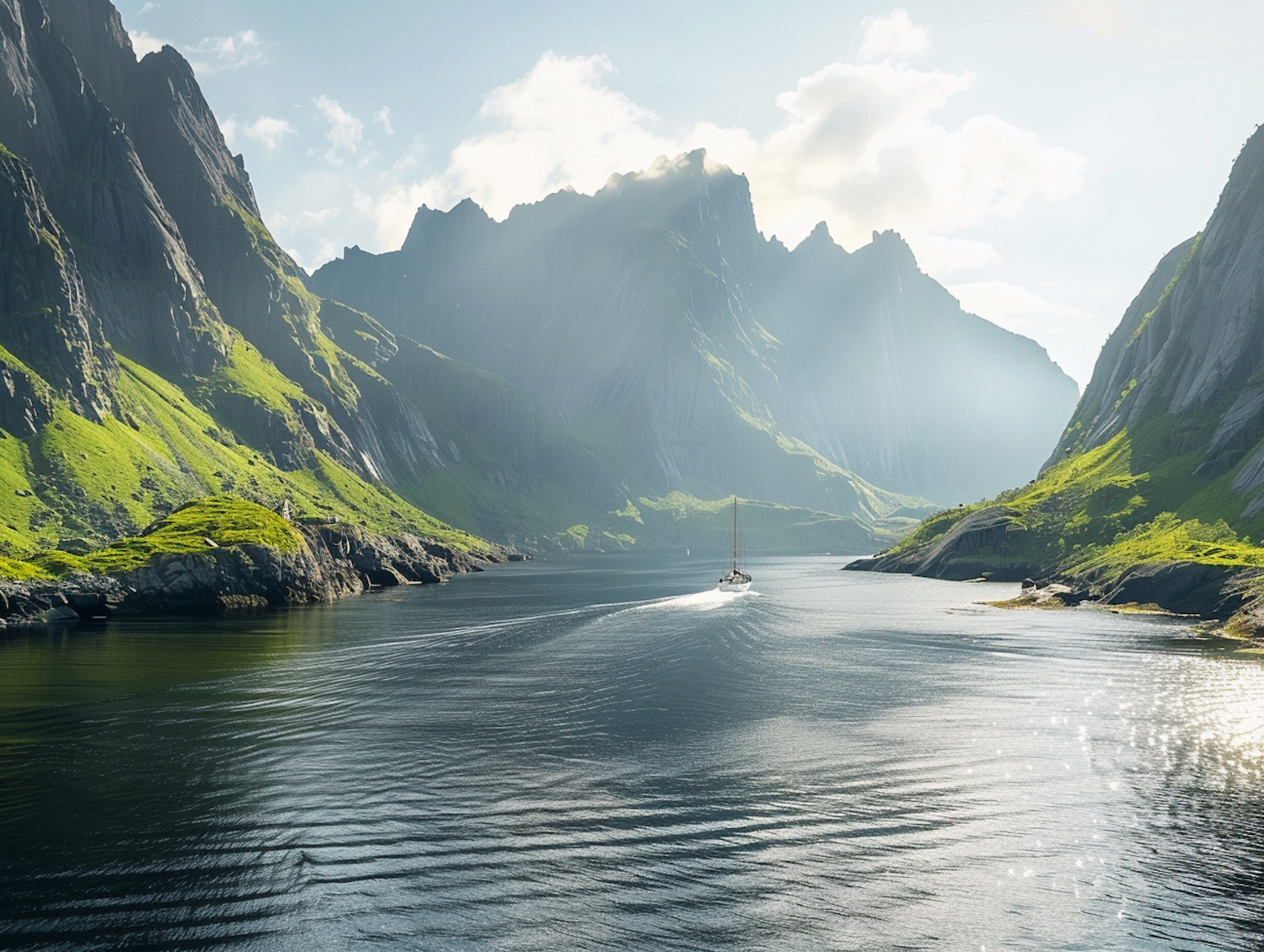 Sailboat navigating a tranquil fjord surrounded by towering green mountains under a sunlit sky.