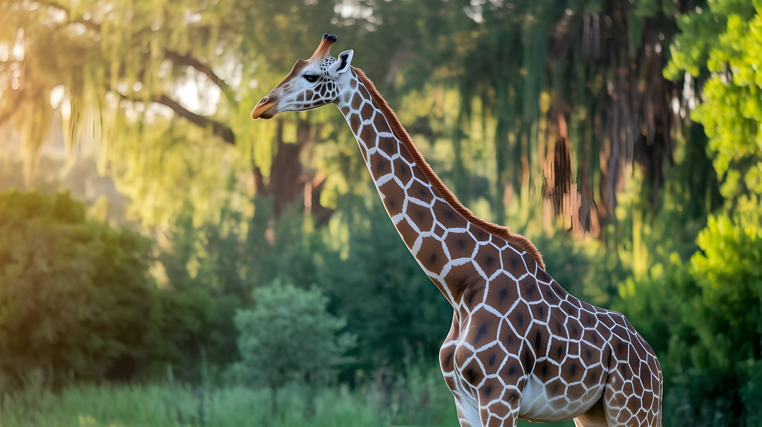 Majestic giraffe with a striking patterned coat stands in lush greenery, bathed in warm sunlight filtering through trees.