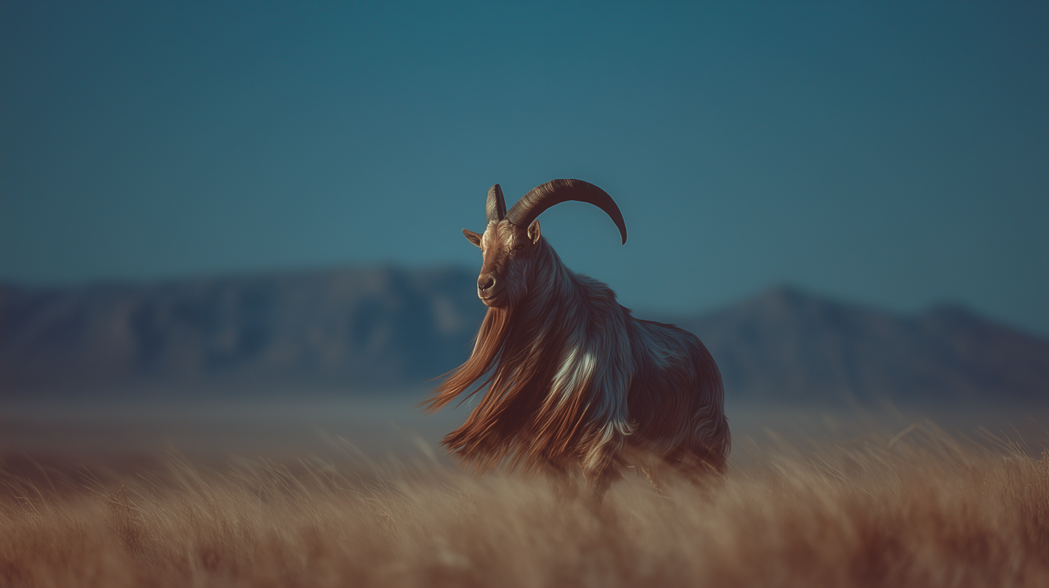 A majestic goat with flowing fur stands in a golden field, set against a clear blue sky and distant mountains, embodying natural beauty.