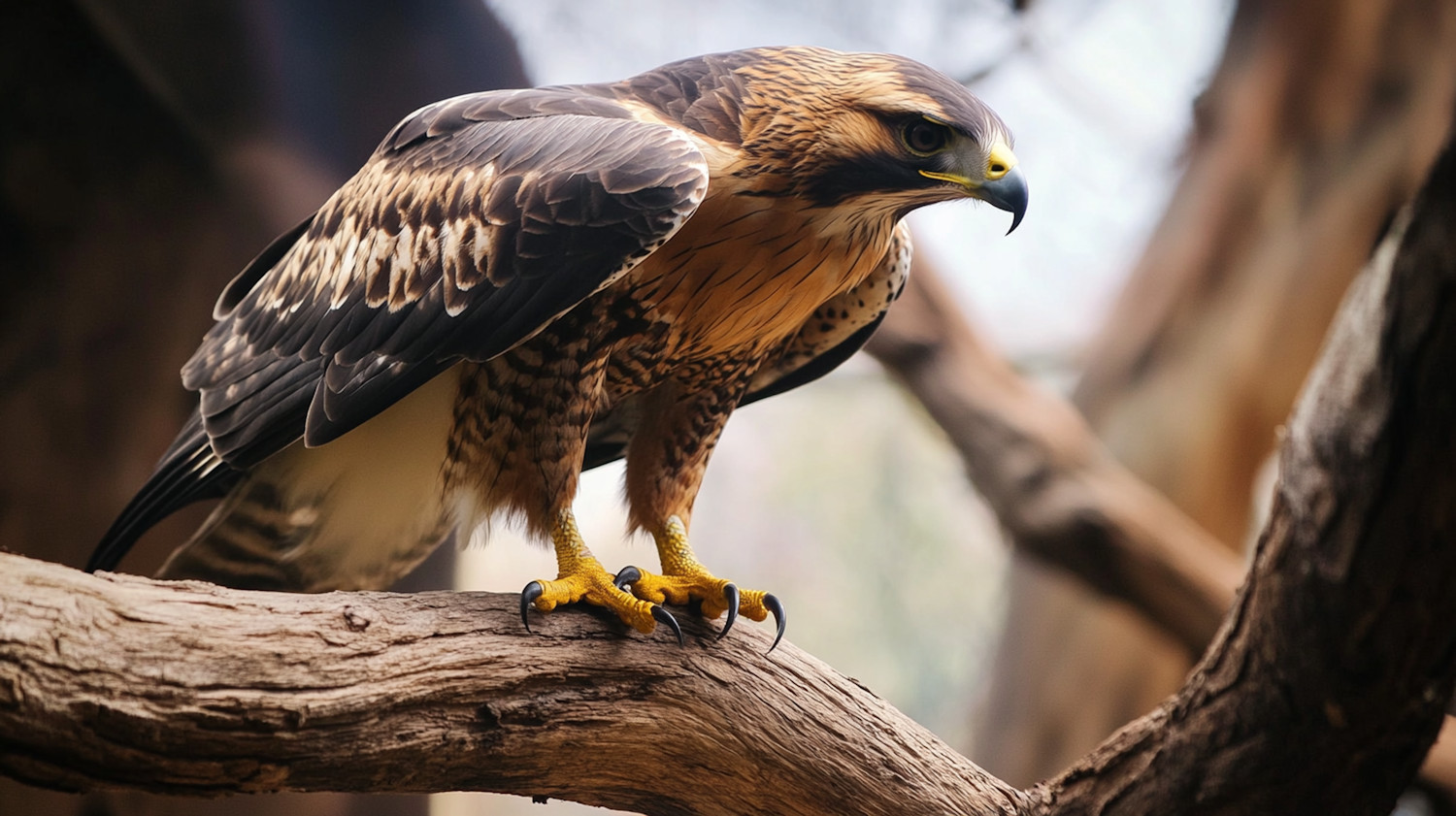 Majestic hawk perched on a tree branch, showcasing its sharp talons and striking plumage in a natural setting.