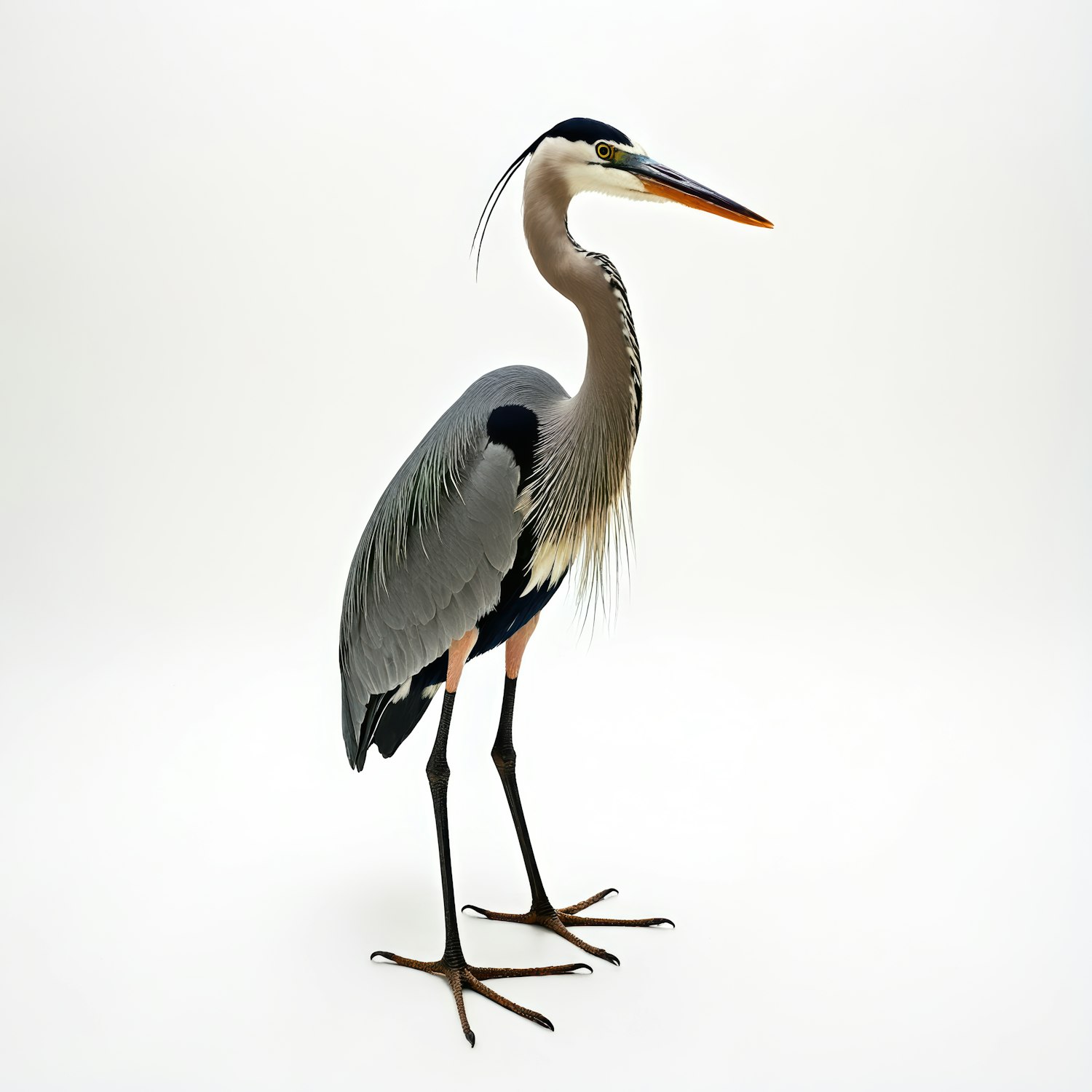 Elegant heron with gray feathers and orange beak against a white background, showcasing its graceful posture and striking features.