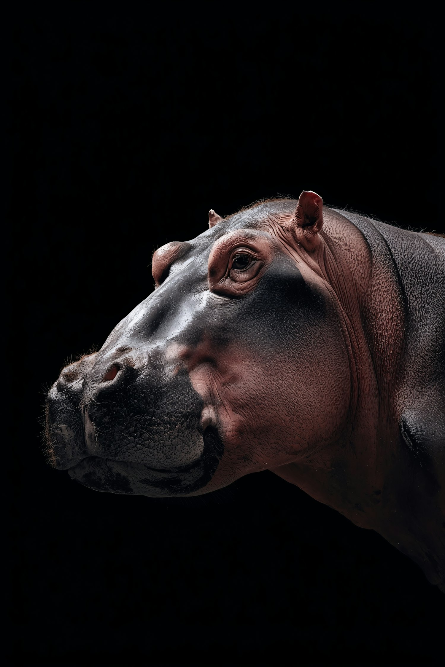 A detailed close-up of a hippopotamus's head against a black background, showcasing its textured skin and expressive features.