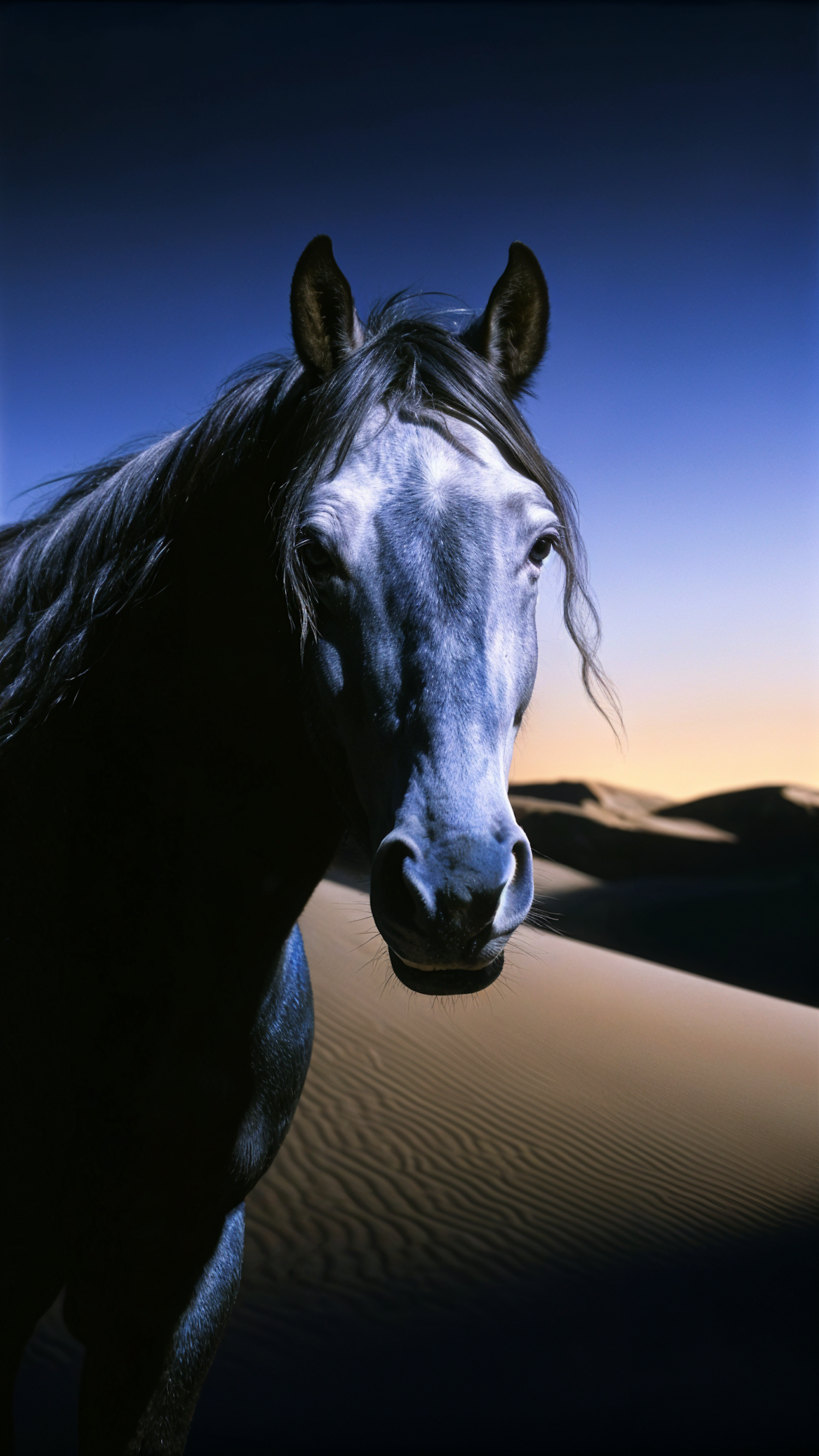 Majestic horse in a desert at twilight, with a glossy coat and flowing mane against a backdrop of sand dunes and a colorful sky.