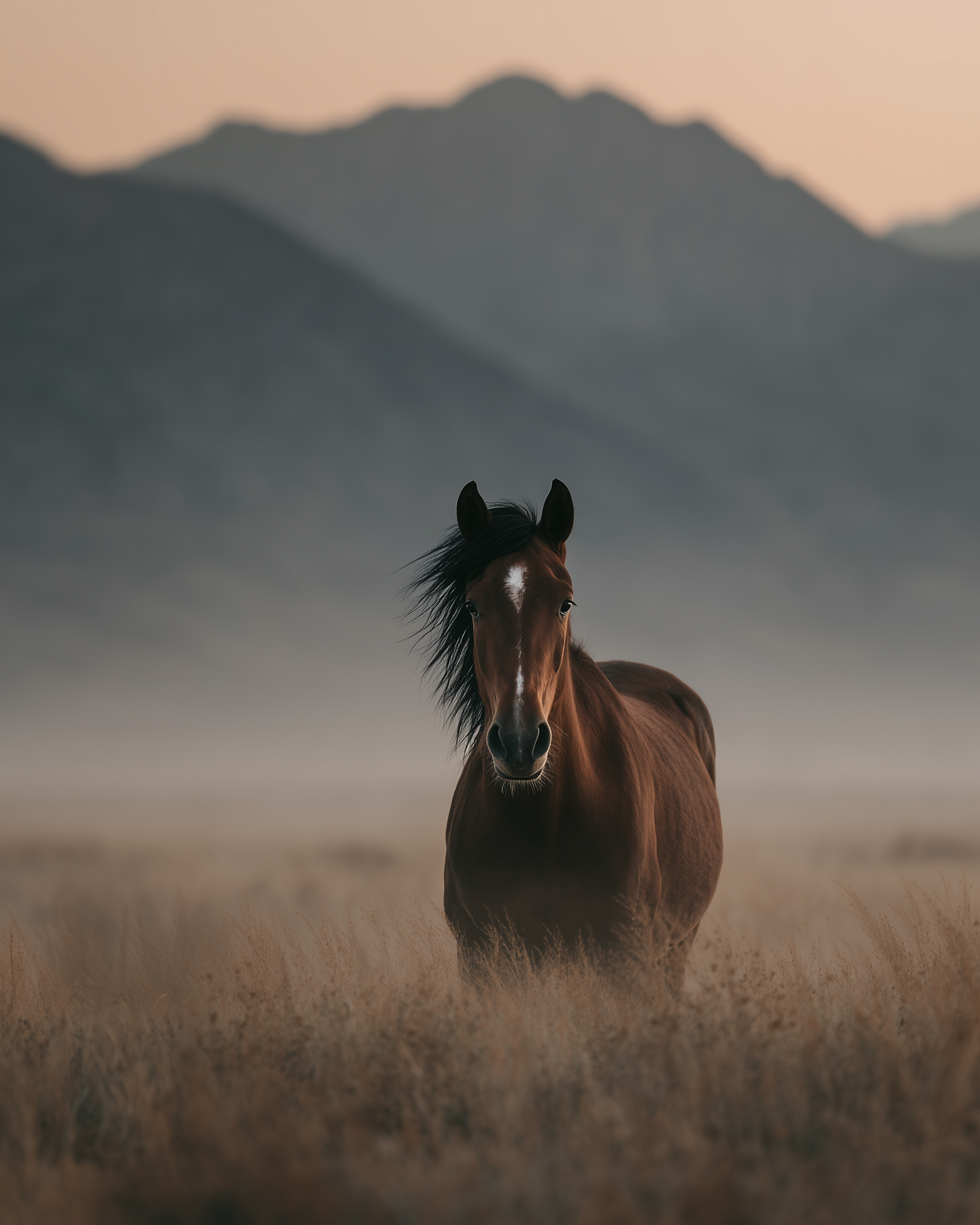 A brown horse with a white blaze stands in a misty field, framed by distant mountains and a warm, serene sky.