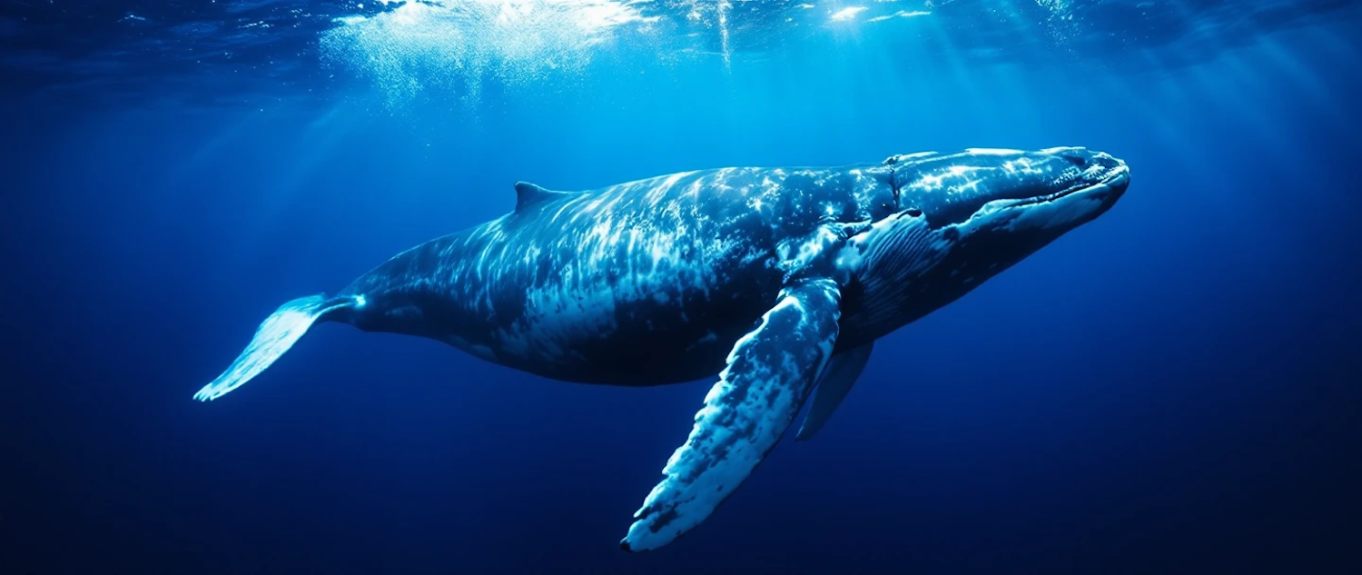 Majestic humpback whale swimming gracefully in deep blue ocean, illuminated by sunlight filtering through the water.