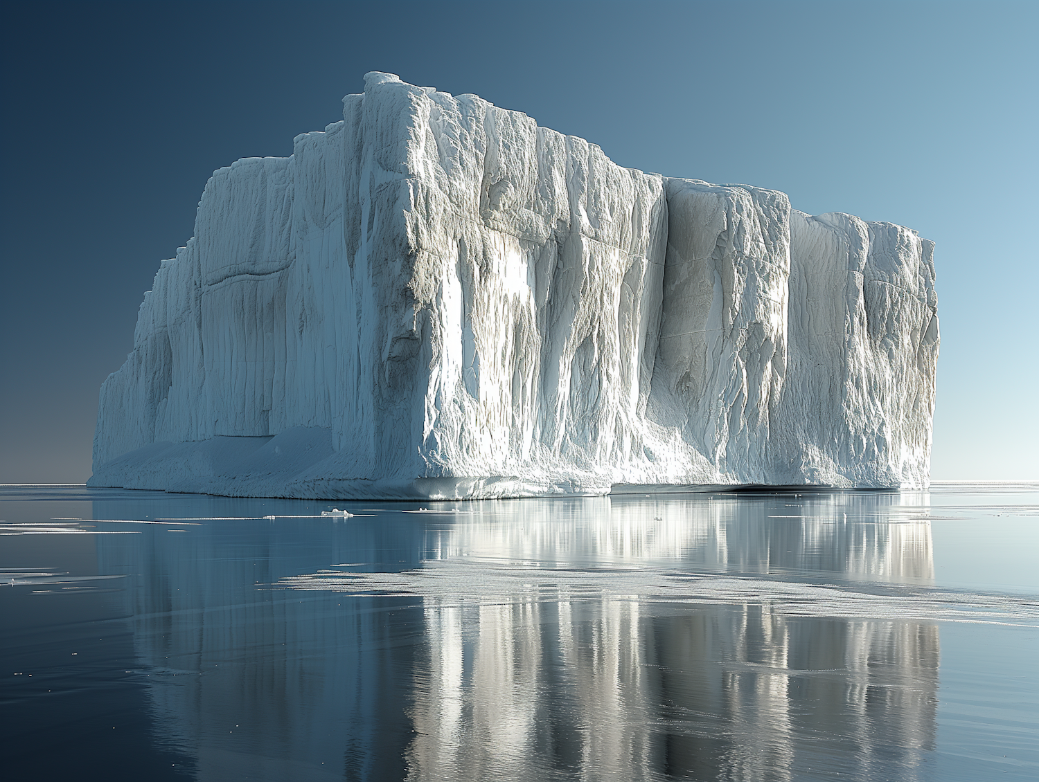 Majestic iceberg reflecting in calm waters under a deep blue sky, showcasing nature's serene beauty and grandeur.
