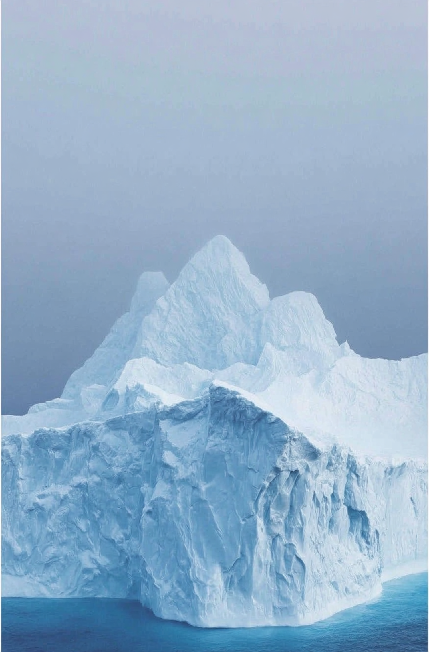 A stunning iceberg with jagged peaks and intricate textures rises from a calm blue ocean under an overcast sky.