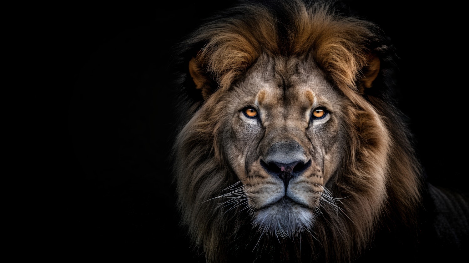 Majestic lion with a thick mane and piercing eyes against a dark background, exuding power and regality.