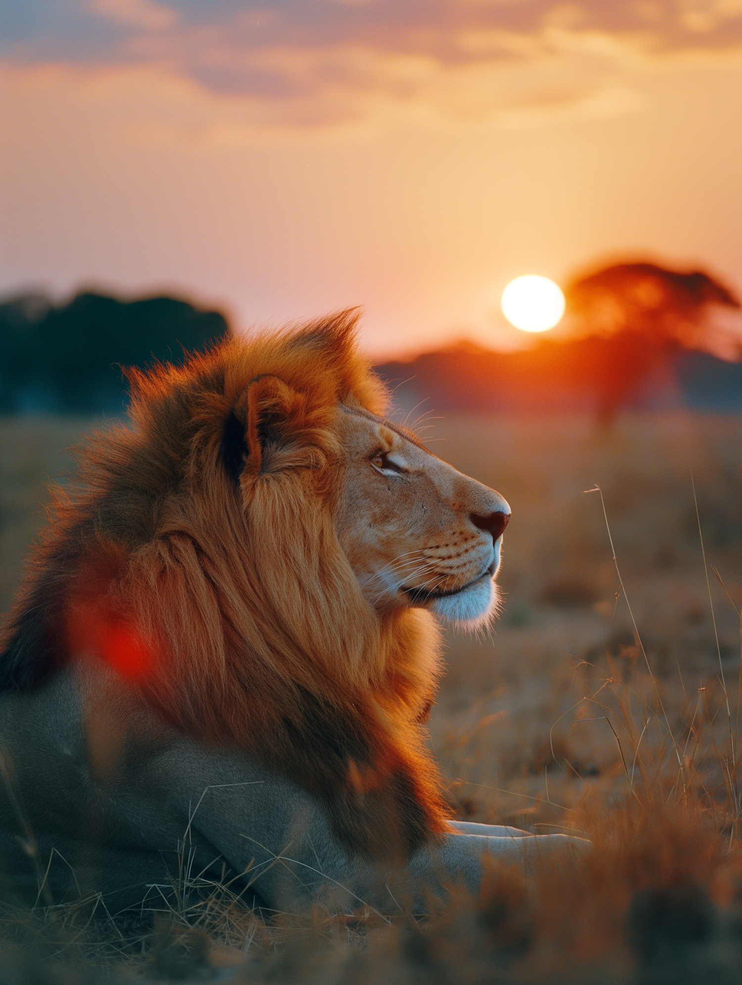 Majestic lion with golden mane in savannah at sunset, warm orange glow, serene and powerful wildlife scene.