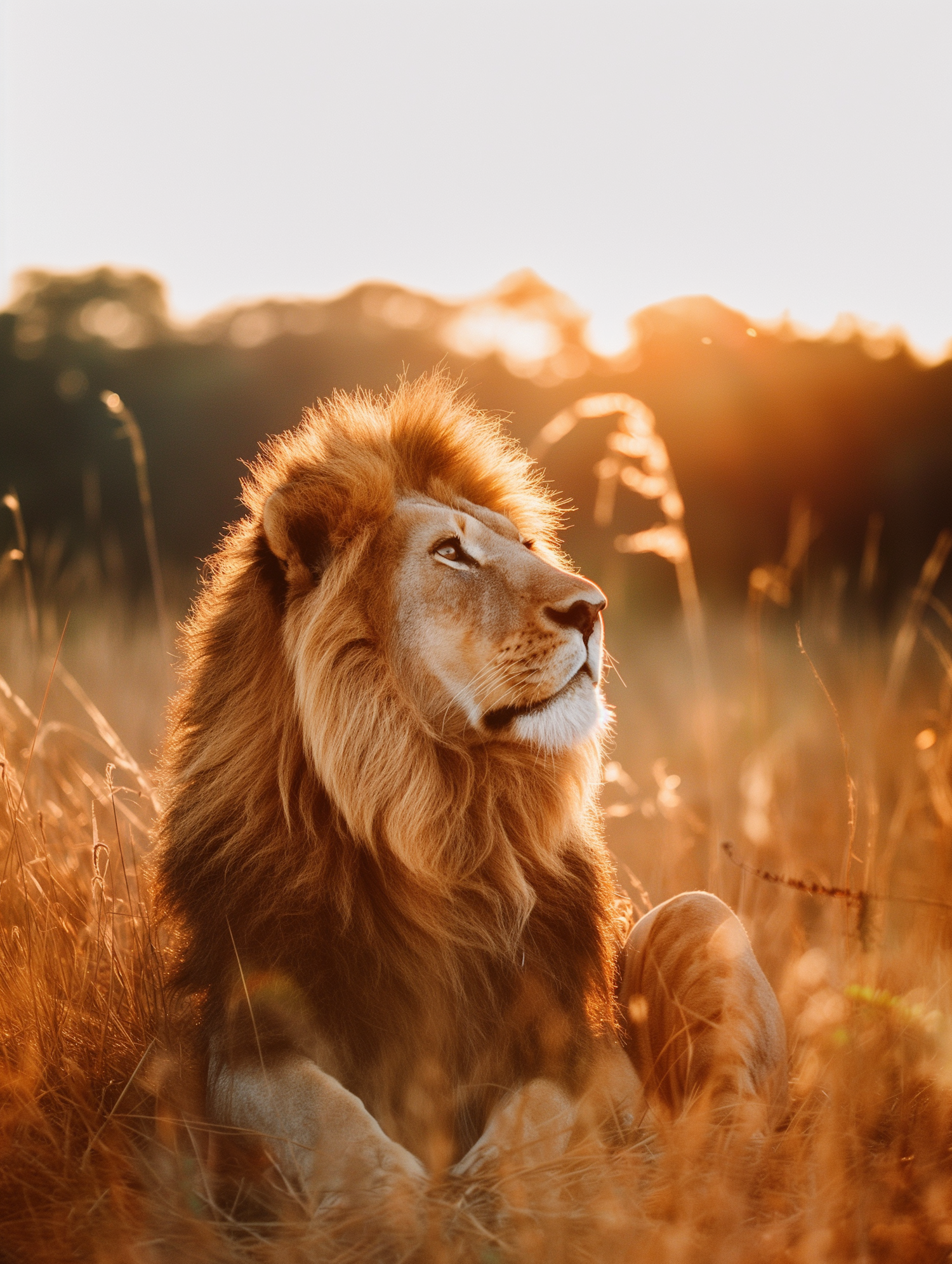 Majestic lion in golden savannah, bathed in warm sunset light, exuding tranquility and natural beauty.