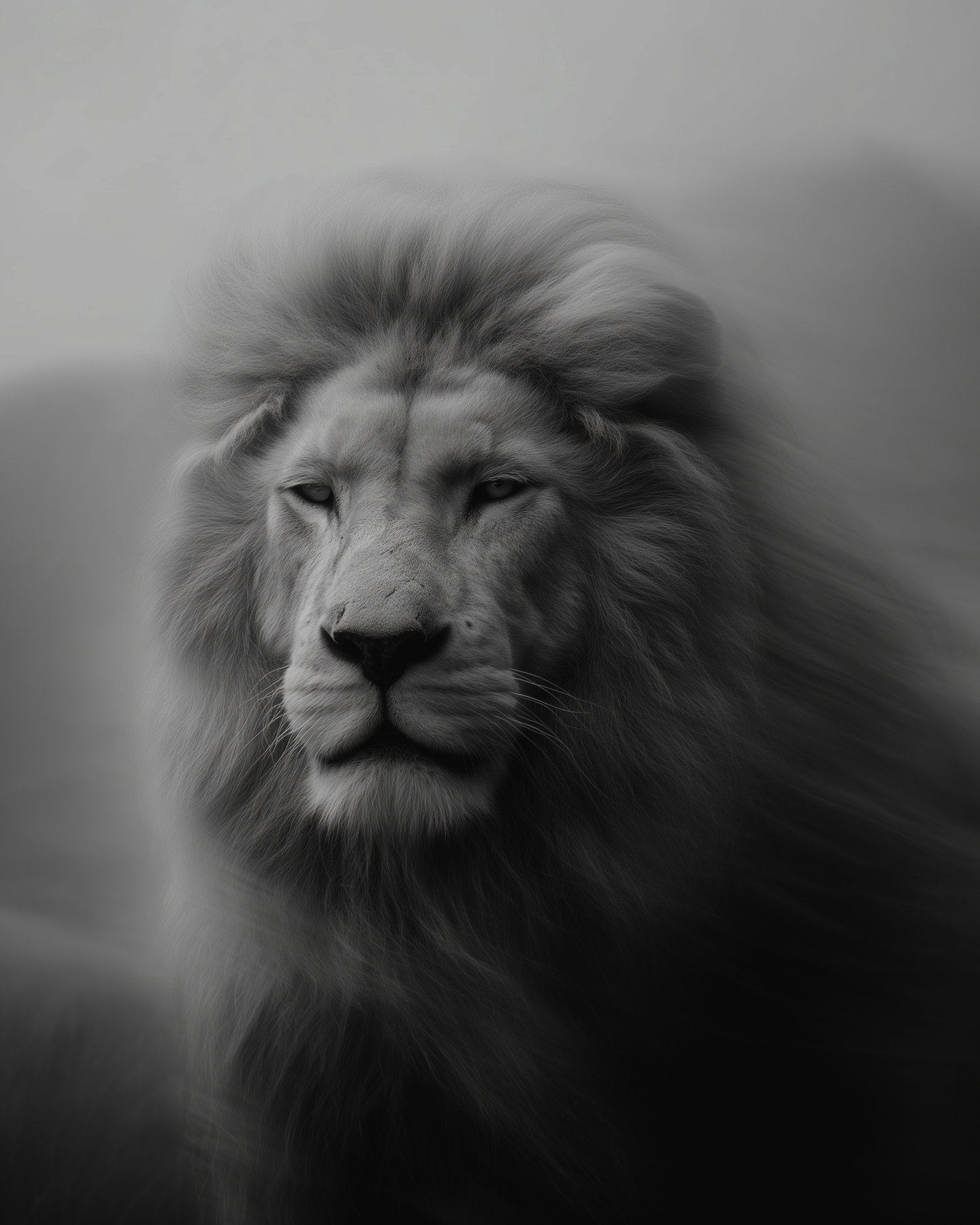 Monochromatic close-up of a lion with a flowing mane, exuding power and regality. Grayscale tones enhance its dramatic and timeless appeal.