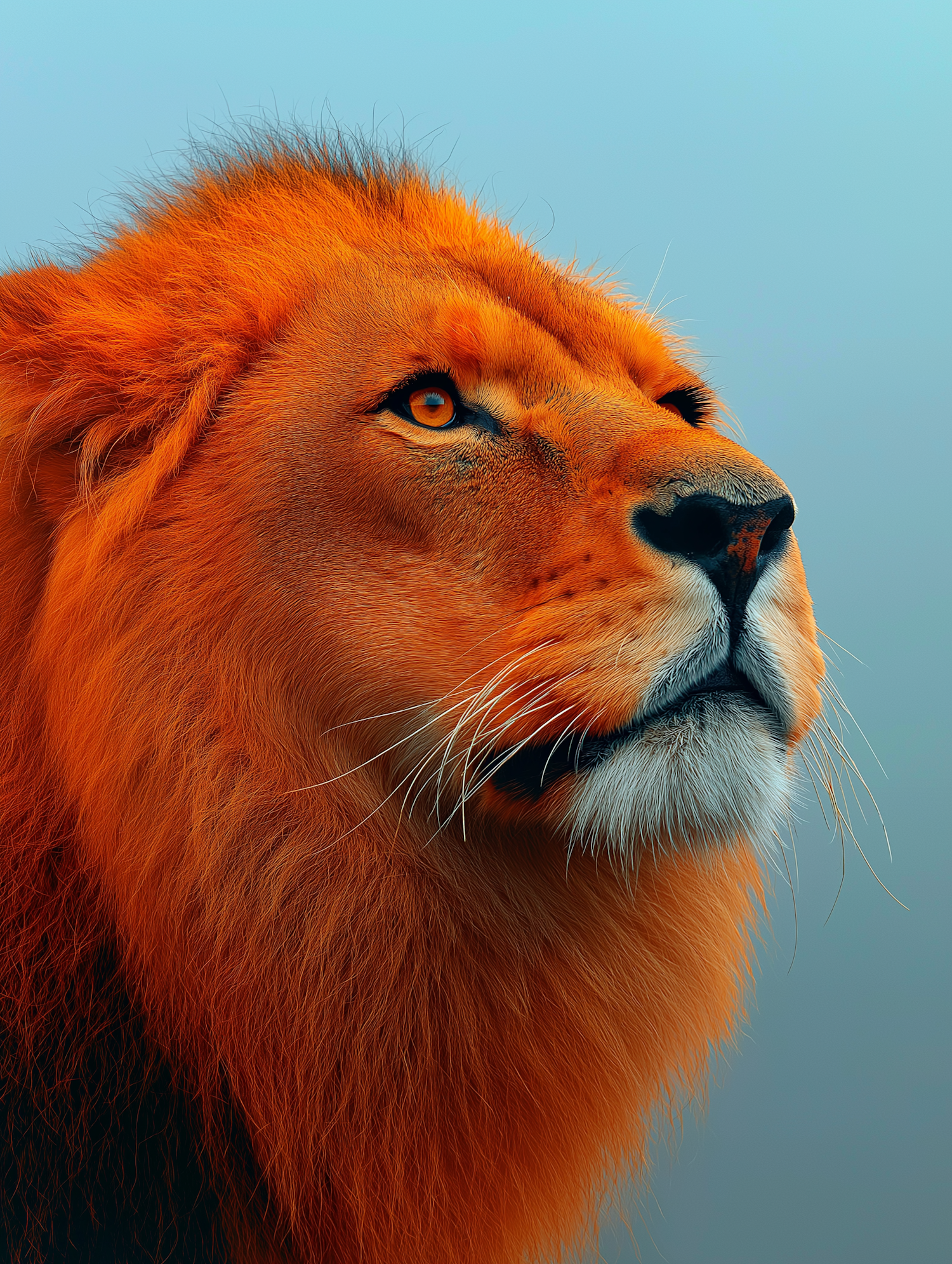 Close-up of a lion with a fiery orange mane and piercing golden eyes, set against a soft blue gradient background.