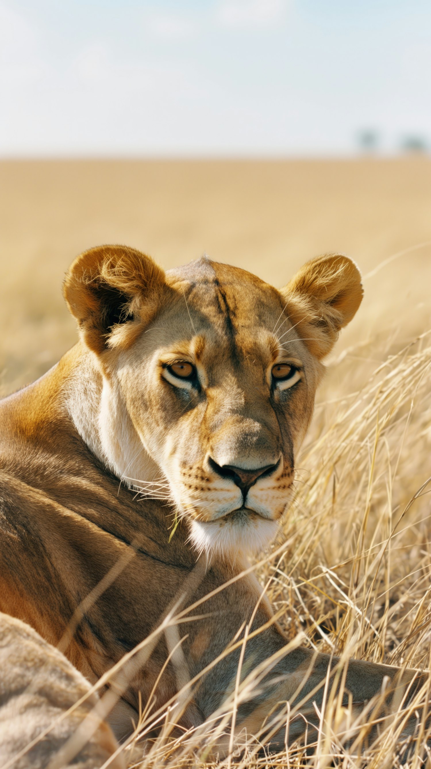 Lioness resting in the golden savannah, her amber eyes and tawny fur blending with the dry grass under the warm sunlight.