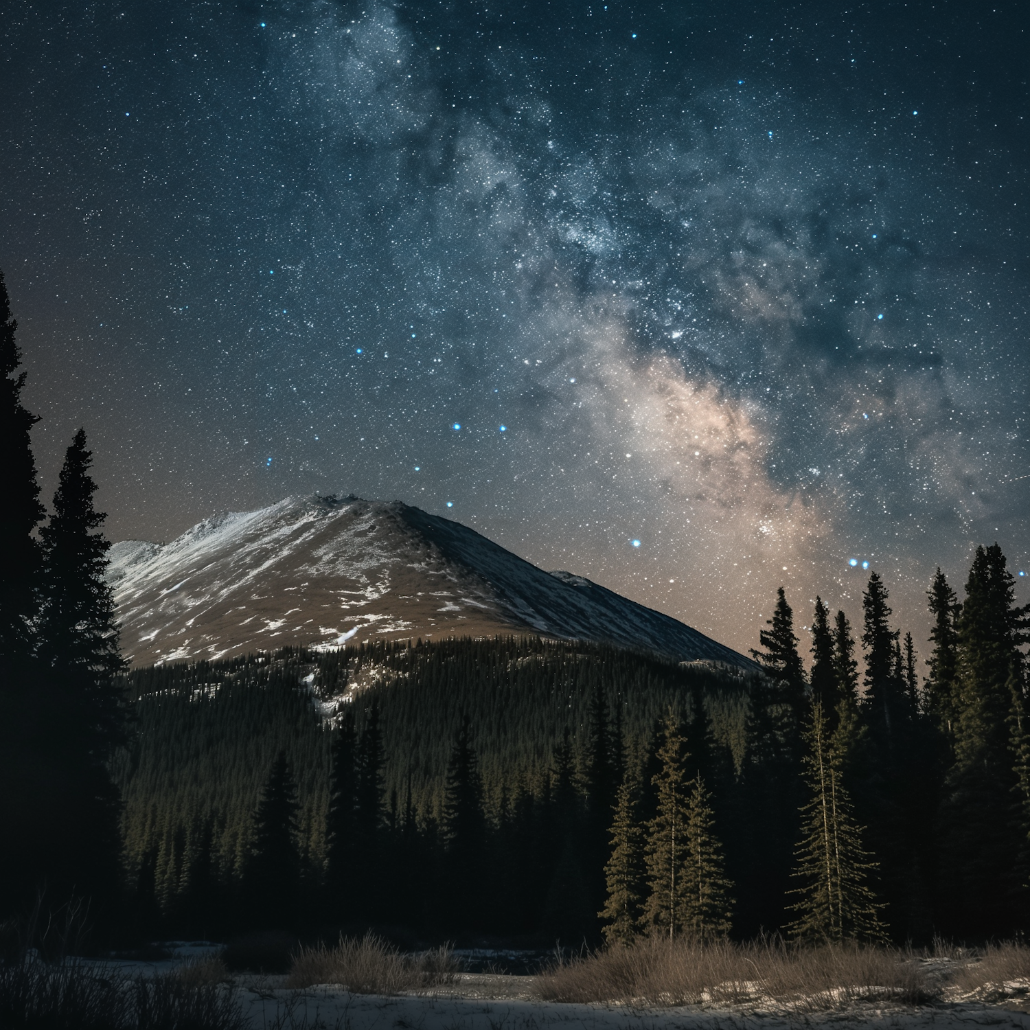 Stunning night sky with Milky Way over a snow-capped mountain and pine forest, creating a serene and awe-inspiring landscape.