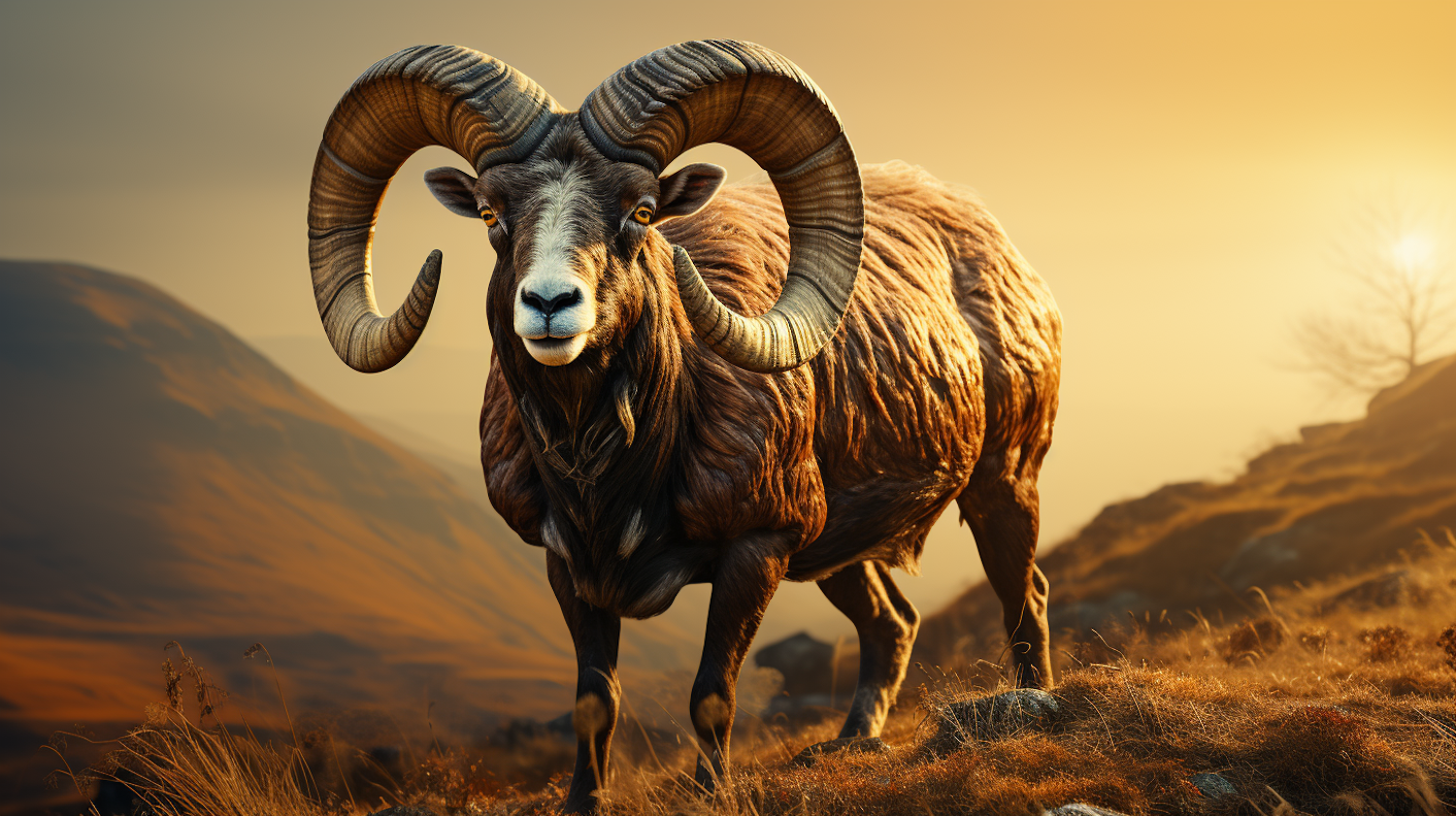 Majestic ram with large curved horns in a golden sunset landscape, showcasing nature's beauty and strength.