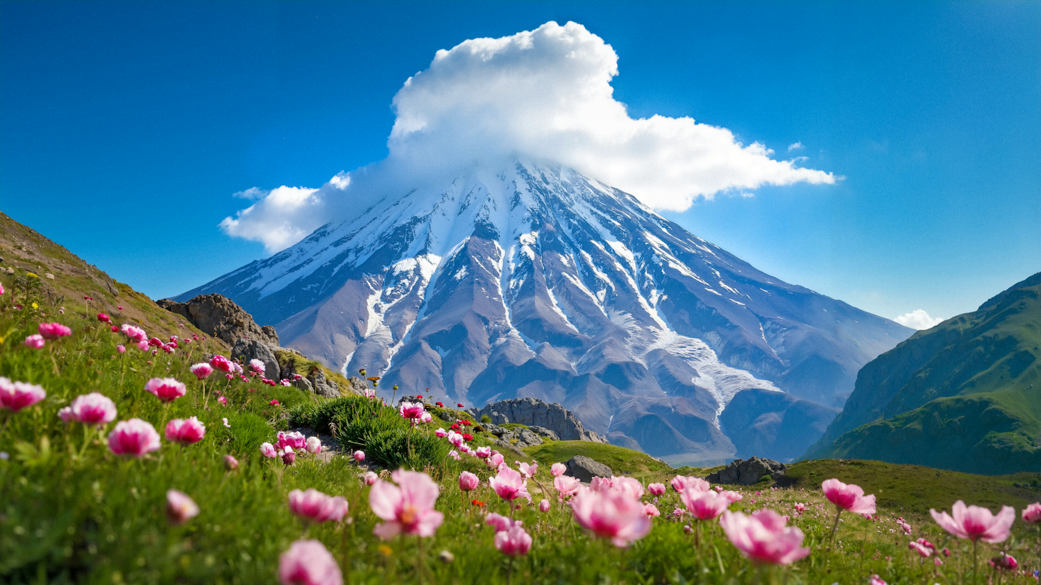 Snow-capped mountain with a cloud at the peak, surrounded by a vibrant meadow of pink flowers under a clear blue sky.