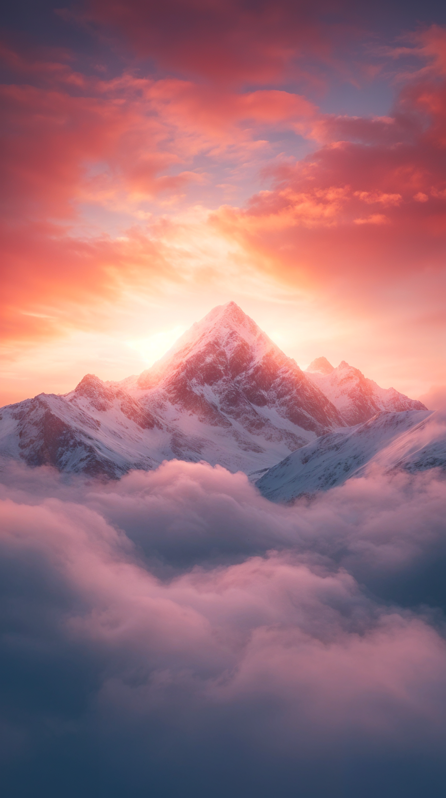 Majestic mountain peak above clouds at sunset, with vibrant orange and pink sky creating a serene and dramatic atmosphere.