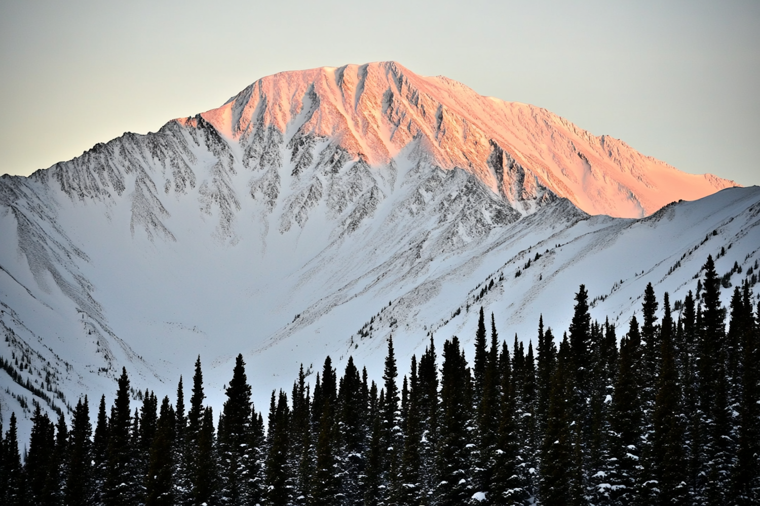 Snowy mountain peak with pink sunset glow, surrounded by dark green coniferous forest under a clear blue sky.