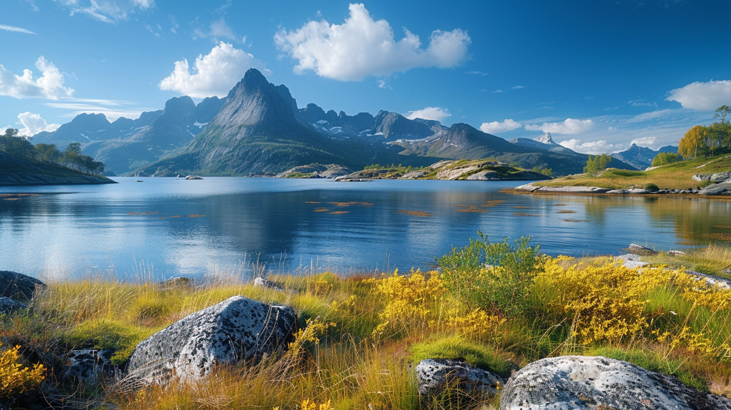 Tranquil lake with yellow wildflowers, jagged mountains, and a vibrant blue sky with fluffy clouds. A serene natural landscape.