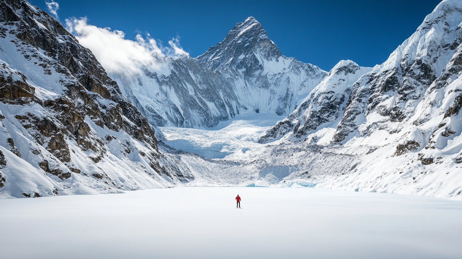 A lone figure in a red jacket stands on a vast snowy landscape, surrounded by towering mountains under a clear blue sky.