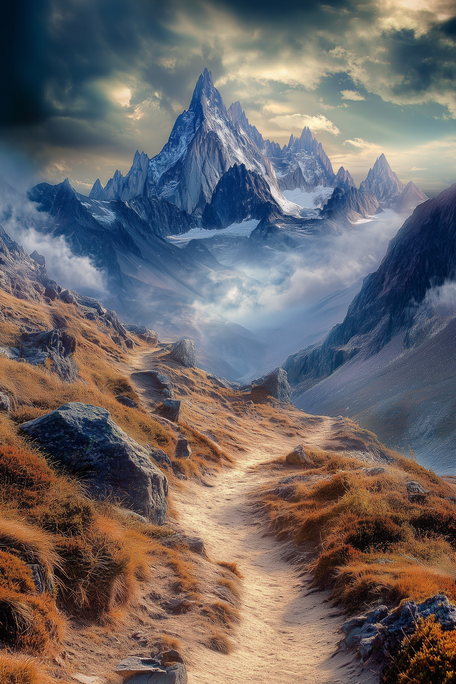 Majestic mountain landscape with a winding path, golden grasses, and towering snow-capped peaks under a dramatic sky.