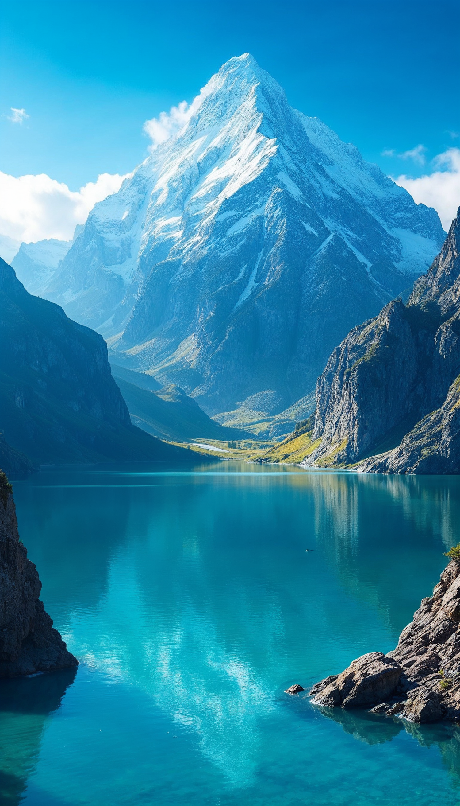 Majestic snow-capped mountain reflected in a turquoise lake, surrounded by lush valleys and rugged cliffs under a clear blue sky.