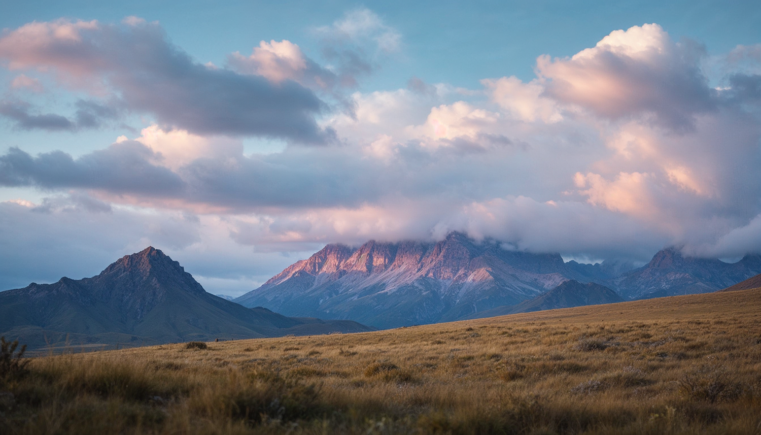 Majestic mountains under a colorful sunset sky, with golden fields in the foreground. A serene and breathtaking landscape.
