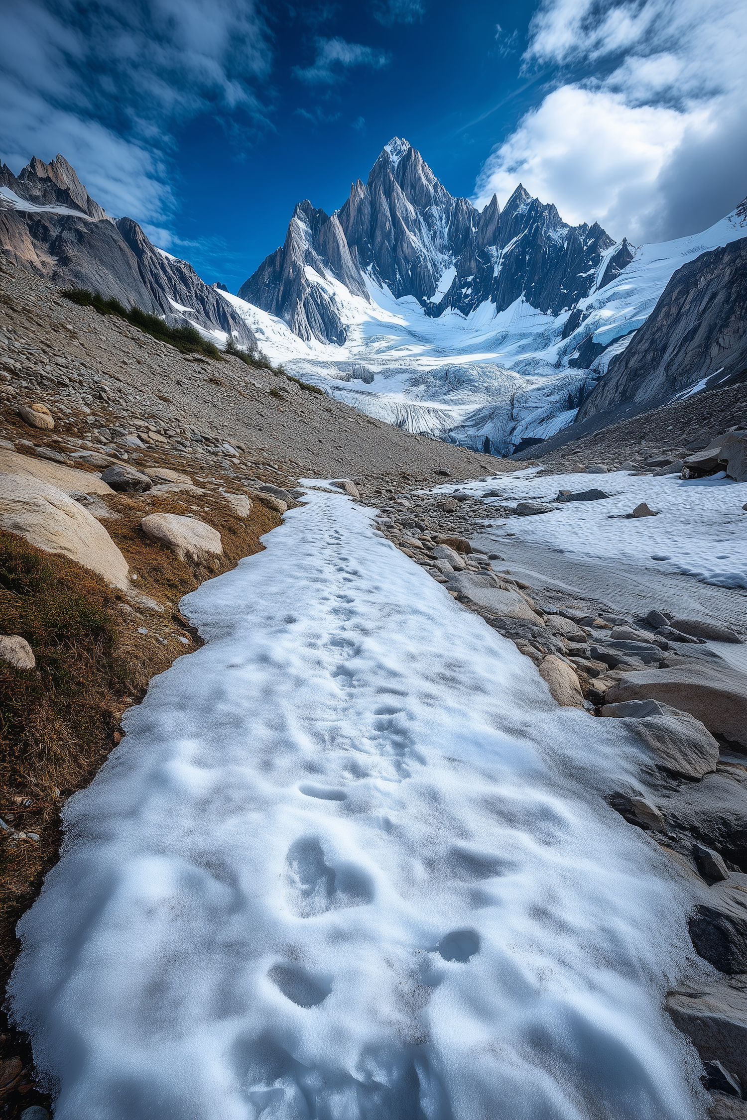 Majestic mountain peak with snow-covered path and footprints, under a vibrant blue sky with drifting clouds.